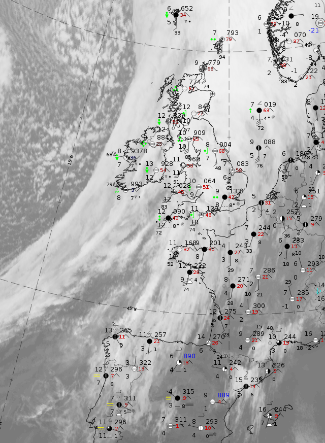 Legend: 10 December 2019 at 12UTC: IR + synoptic measurements (above) + probability of moderate rain (Precipitting clouds PC - NWCSAF).