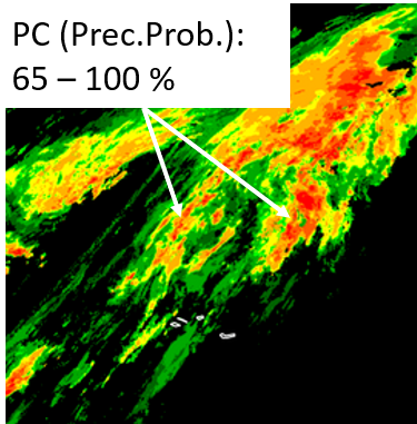 In the case from 10 December 2019/12 UTC (left side), the synoptic observations do not report any precipitation in the southern half from Spain into the English Channel, where very low precipitation probabilities exist. In the northern half over the image, over the British Isles, there are some areas with higher probabilities of precipitation. This is in the northern region of the warm sector where cloud associated with the THR and the warm front are difficult to distinguish and delineate.