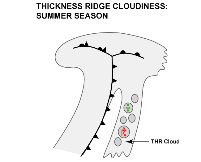 The Thickness Ridge cloud band is multi-layered and normally exists without significant precipitation except in cases with embedded convection.