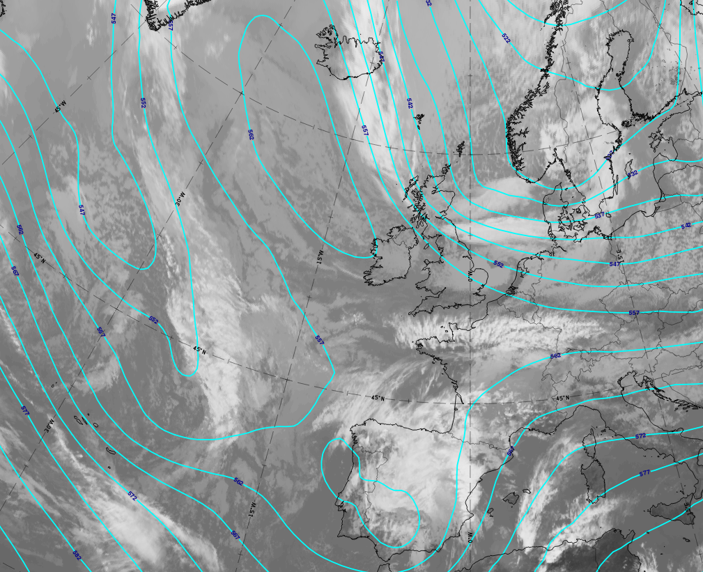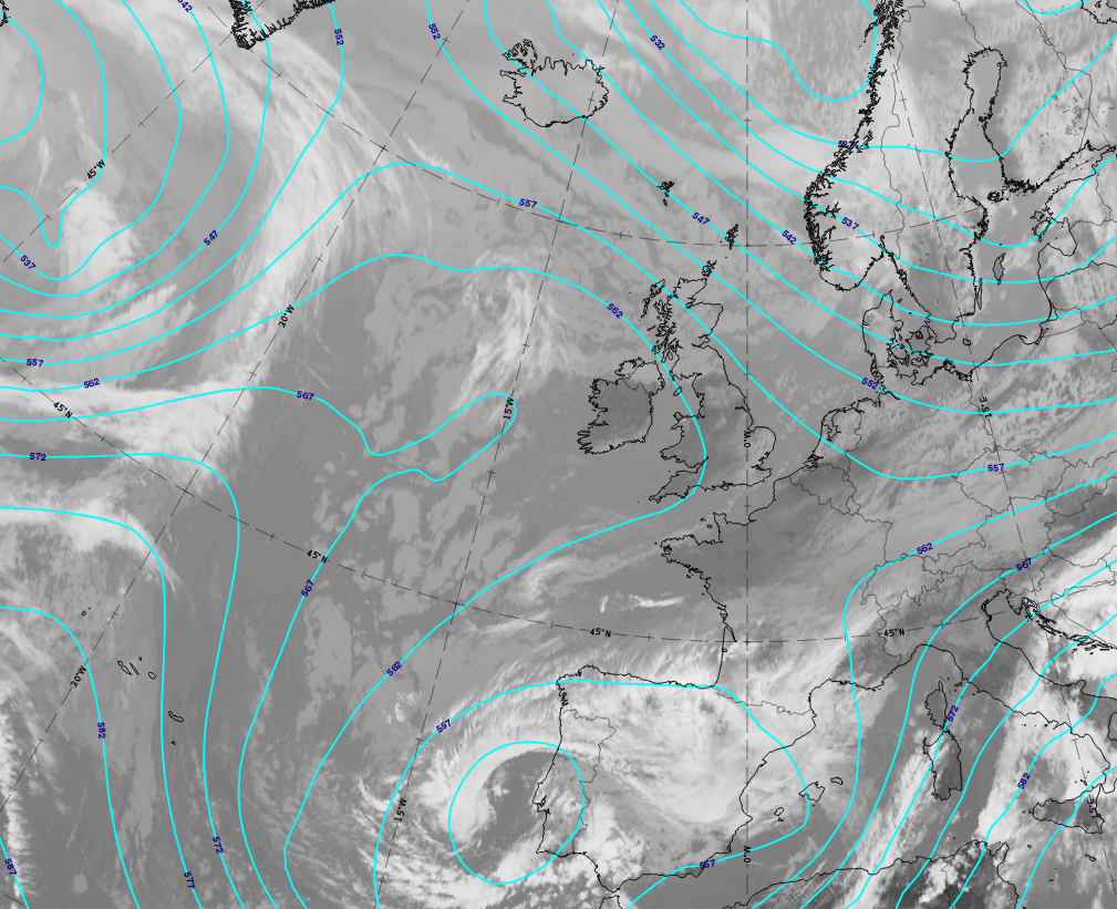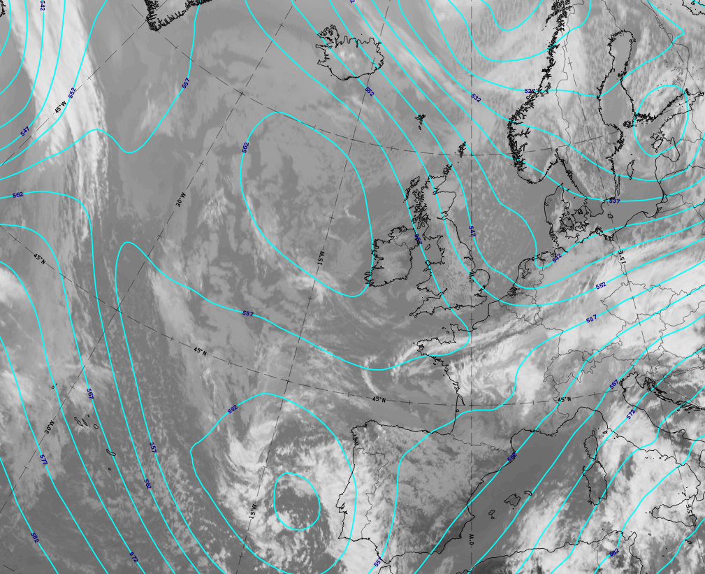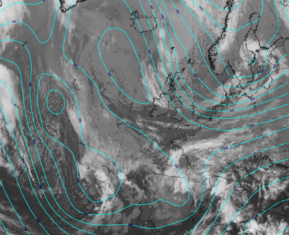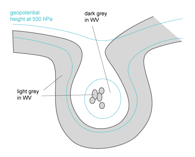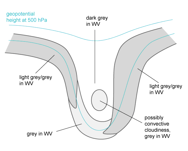 | WV | Cloud bands are white to light grey; the centre of the cut off low is dark grey. |