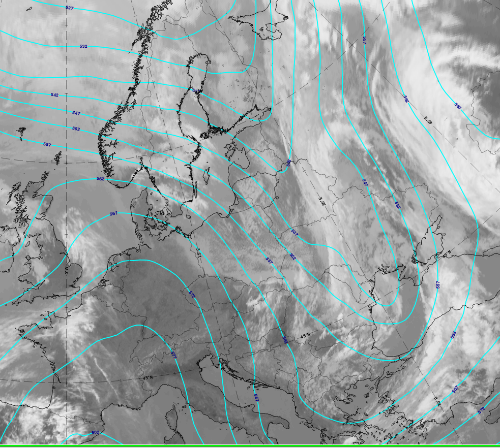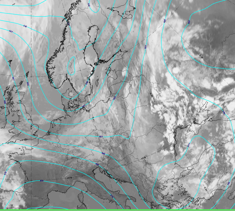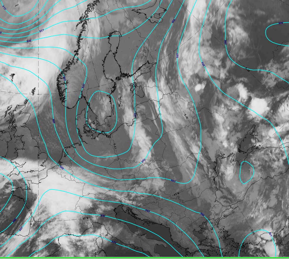 | IR | A light grey to white cloud band exists at the southern leading side of the upper level trough. Some light grey clouds exist in the trough centre over Southern Sweden. No cloud system exists at the rear side of the trough - the next cloud system is far to the NW. |