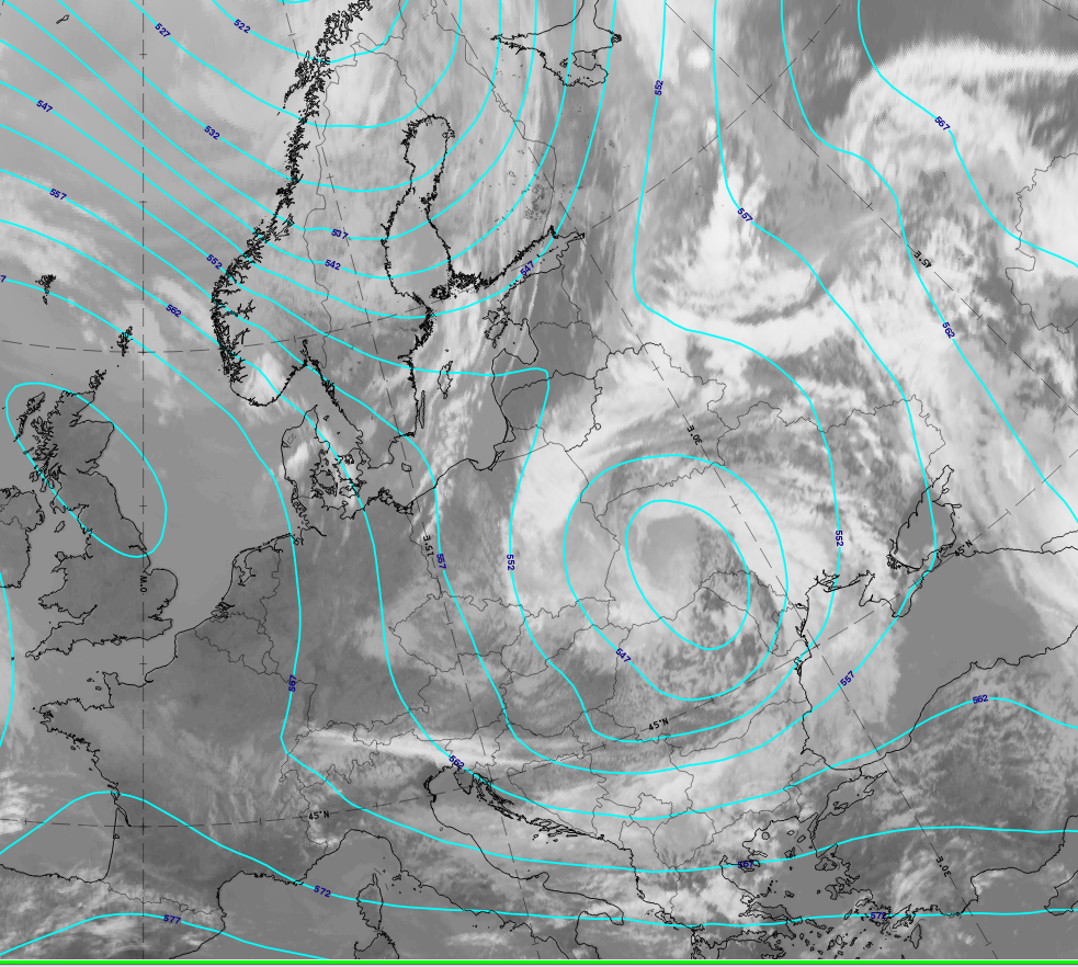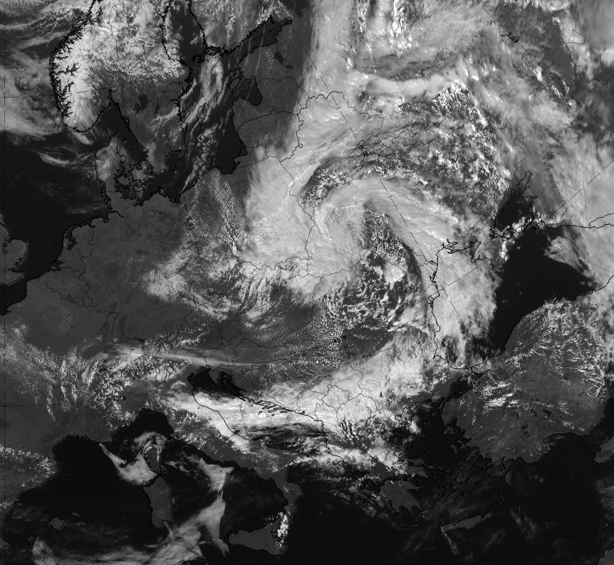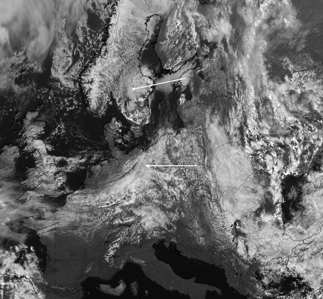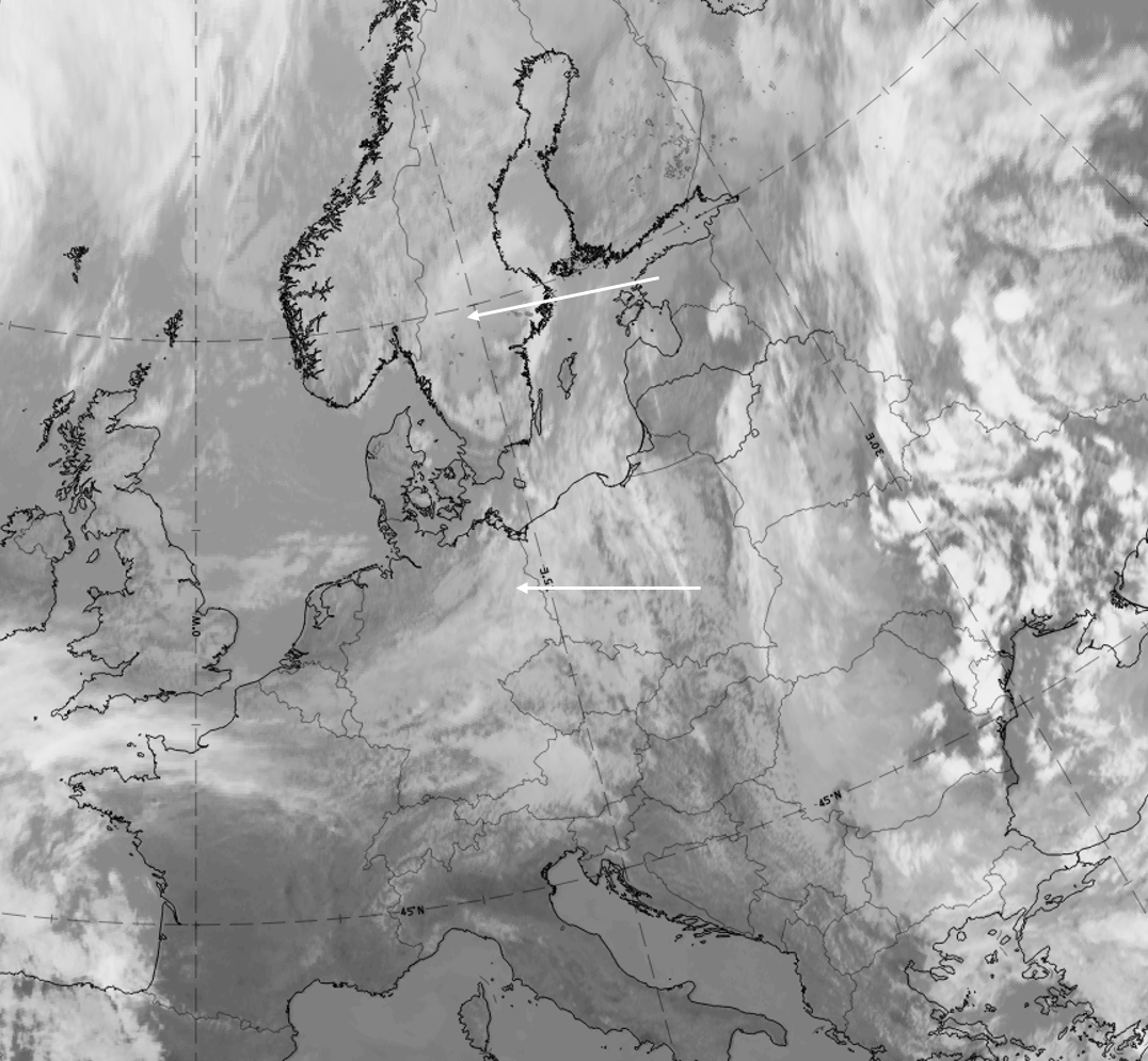 The cloud band at the leading edge of the torn-off low can be seen over Poland. Some cloud cells exist in the low centre over Southern Sweden and some fibrous clouds from the next system exist over Northern Norway.