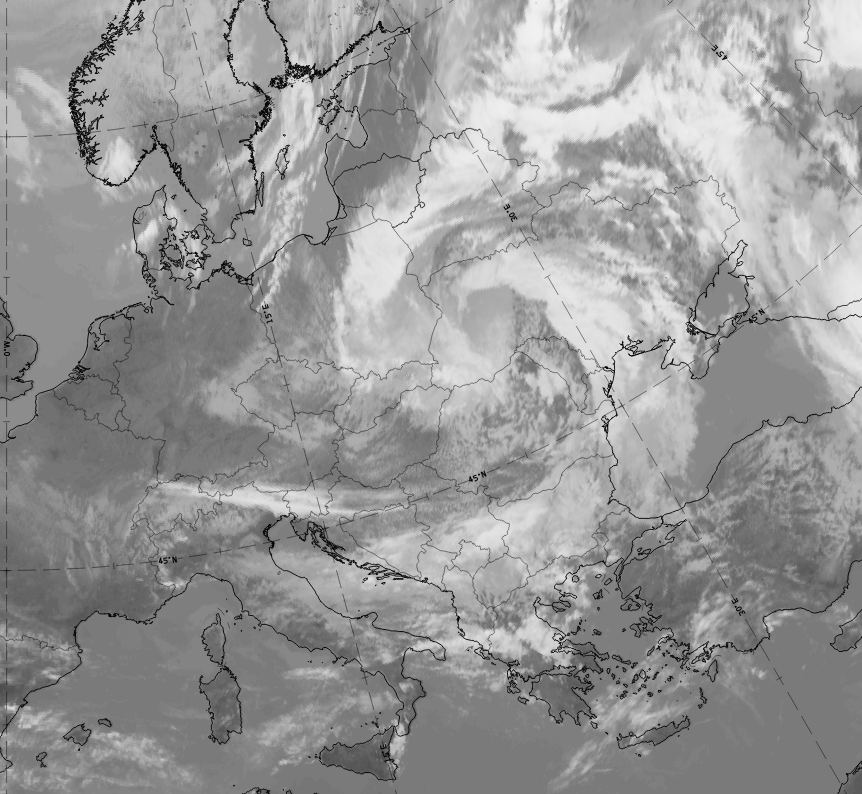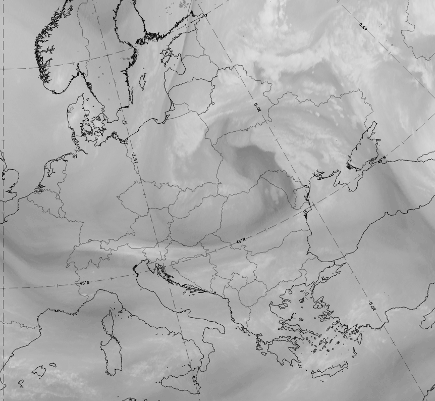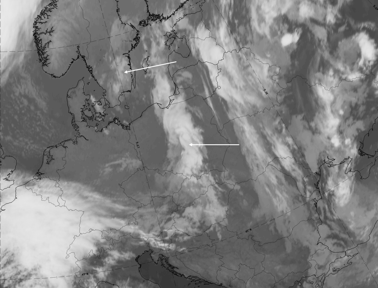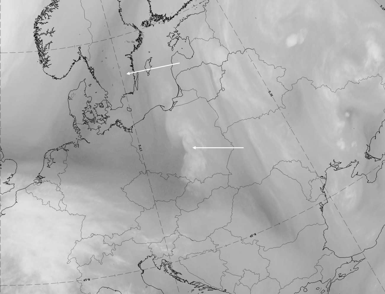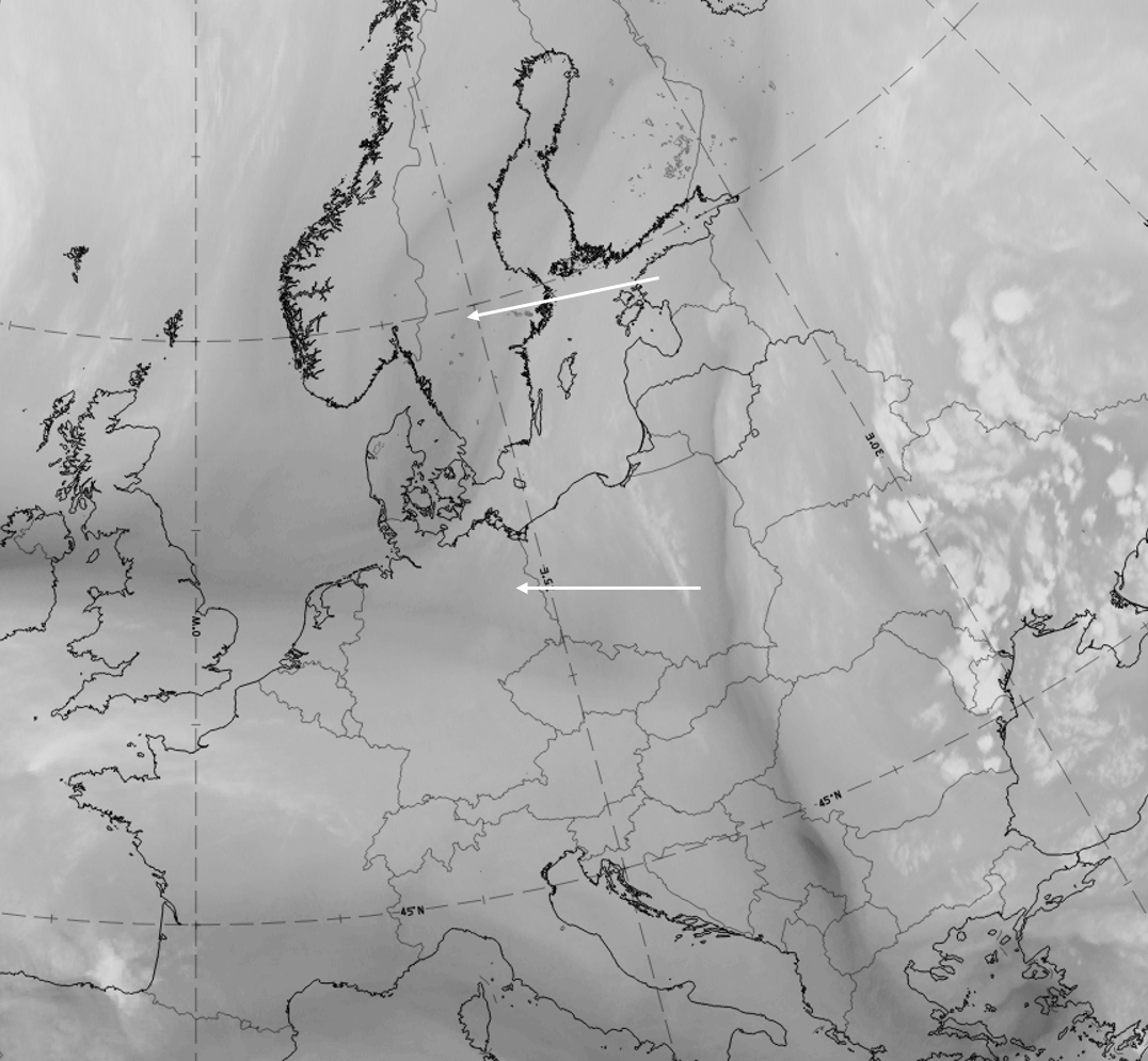 | WV | The whole area shows grey colours but not distinct band-like structures; darker grey colours exist in the trough centre over Sweden. |
