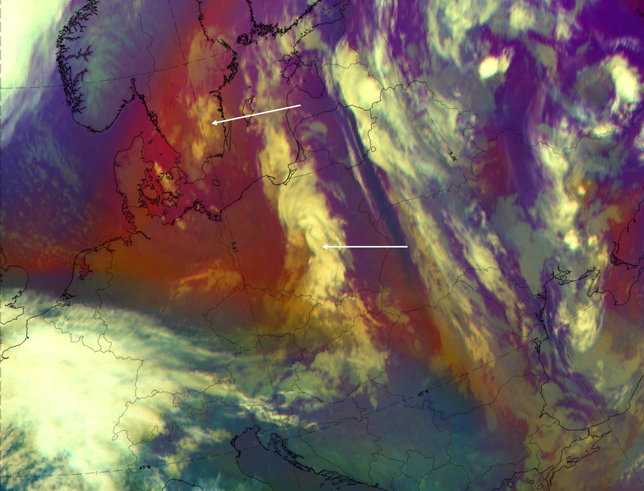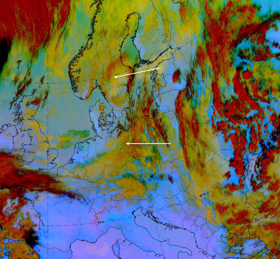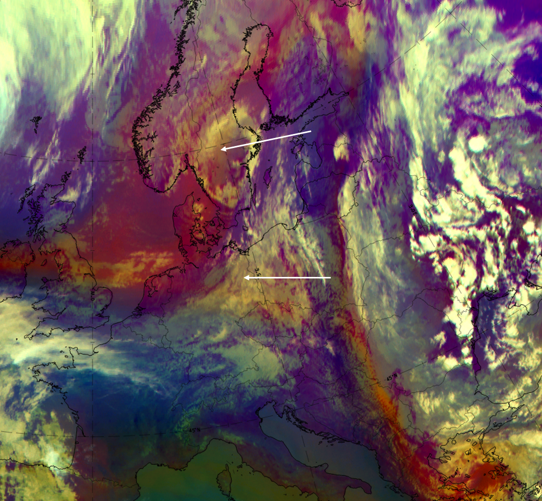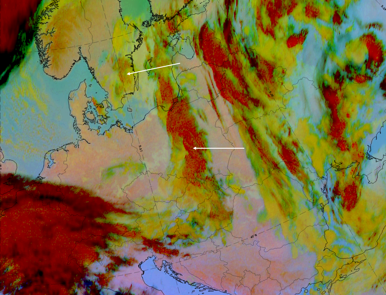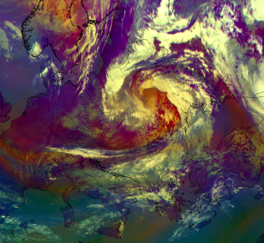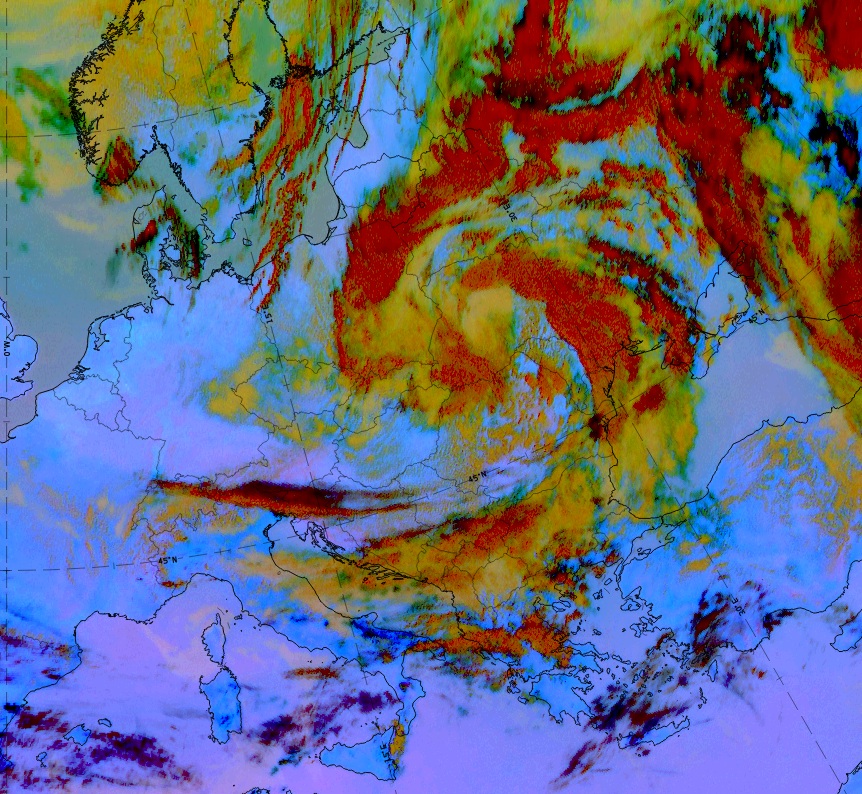 | Dust RGB | Dark red colours are the cloud band at the leading side of the tear-off low, indicating thick ice cloud; the same is true for small cold air clouds in the centre over Southern Sweden; the cloud free areas are mostly in pinkish blue, indicating higher humidity in the air near the ground below. Some greenish areas indicate thin mid-level cloud. |
