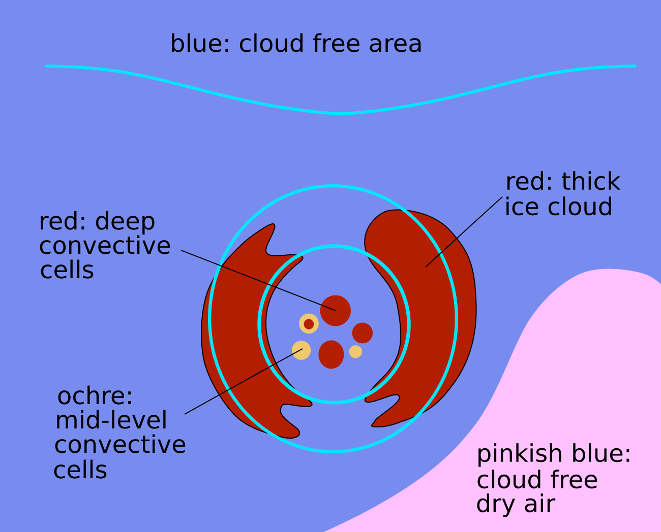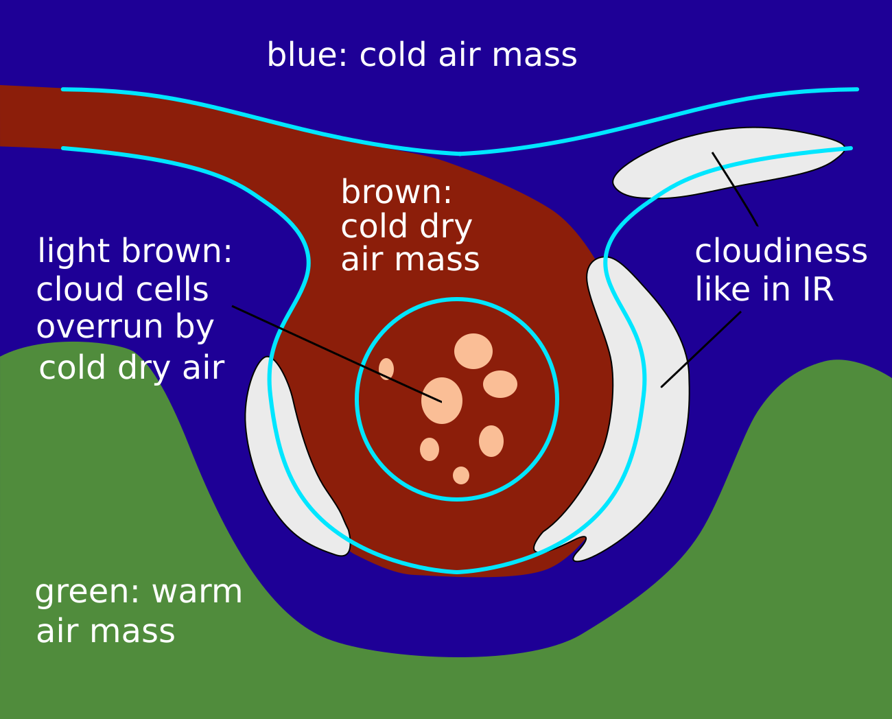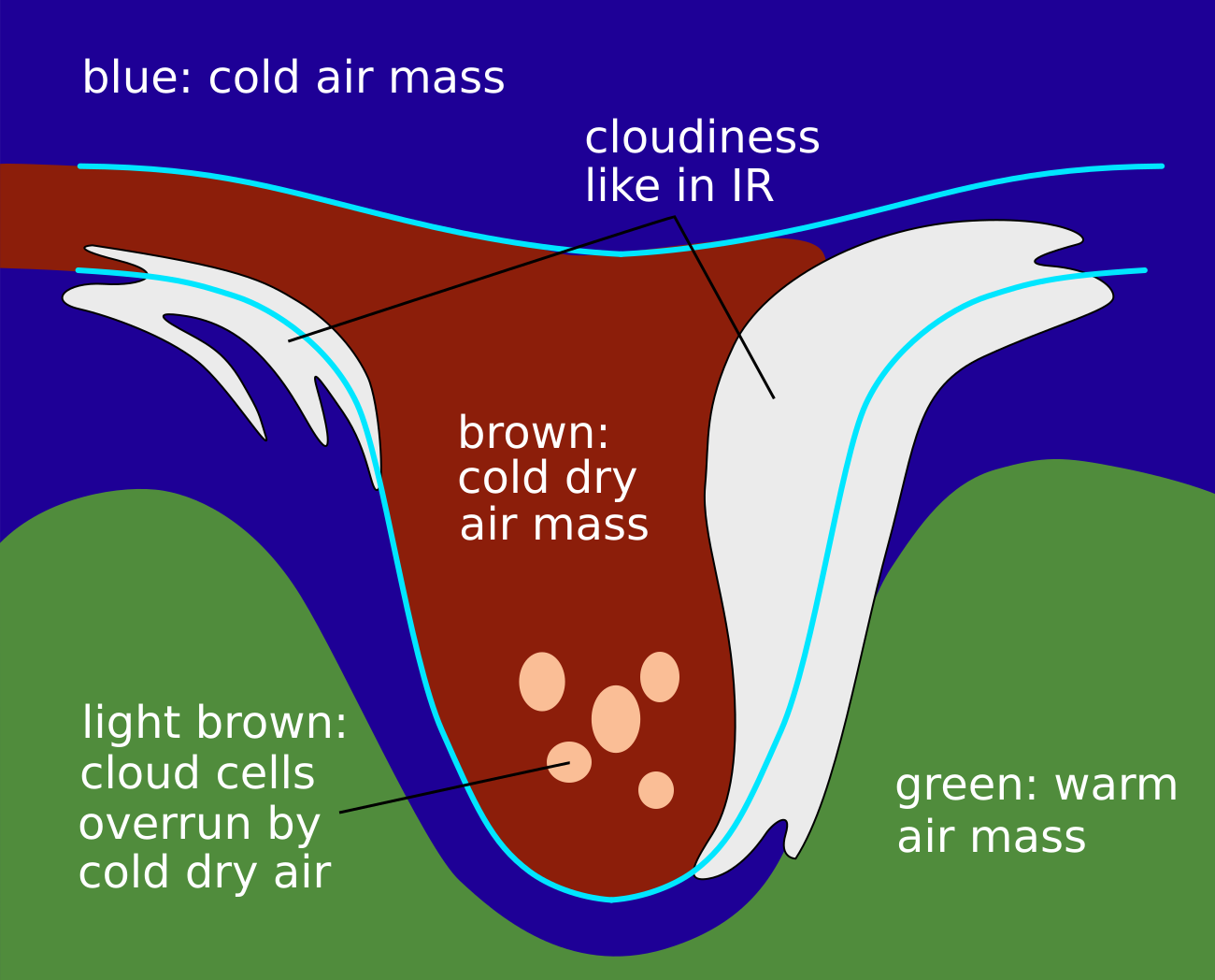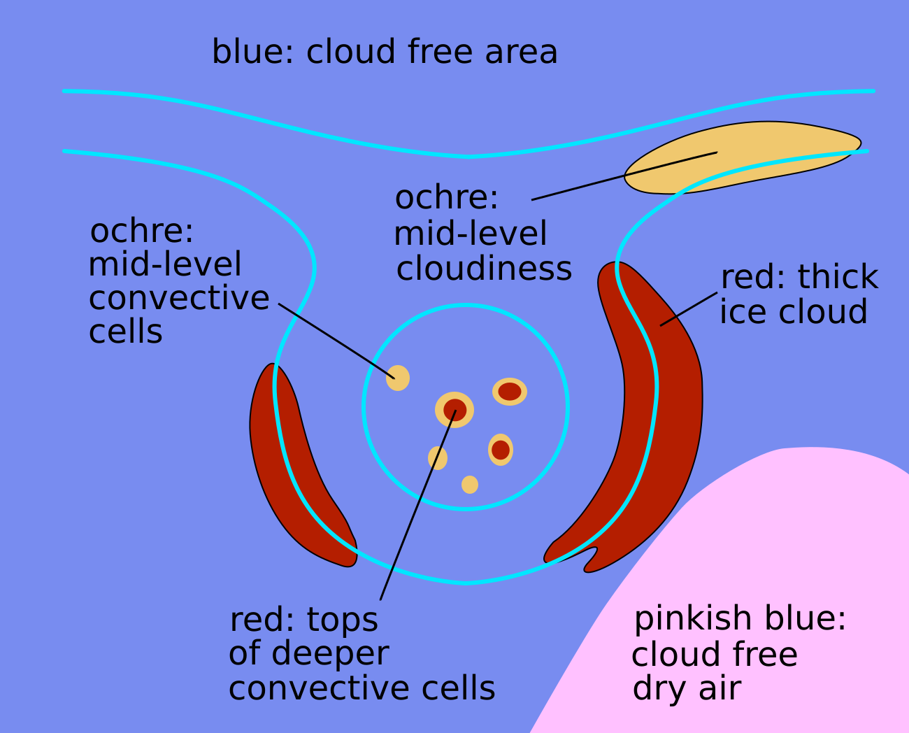 The cloud free areas within the trough show blue to pinkish blue colours, while the cloud band at the leading side of the trough usually exhibits dark red colours, indicating thick ice cloud. If clouds exist at the rearward side, it can vary from dark red to black depending on the thickness of the ice clouds there. If there is already cold air cloudiness in the trough centre, this stage of the cut off process usually results in ochre cloud colours, indicating that the cloud-tops are low to mid-level. For cases over land in wintertime, this centre can also be filled by ochre mid-level cloud patches.