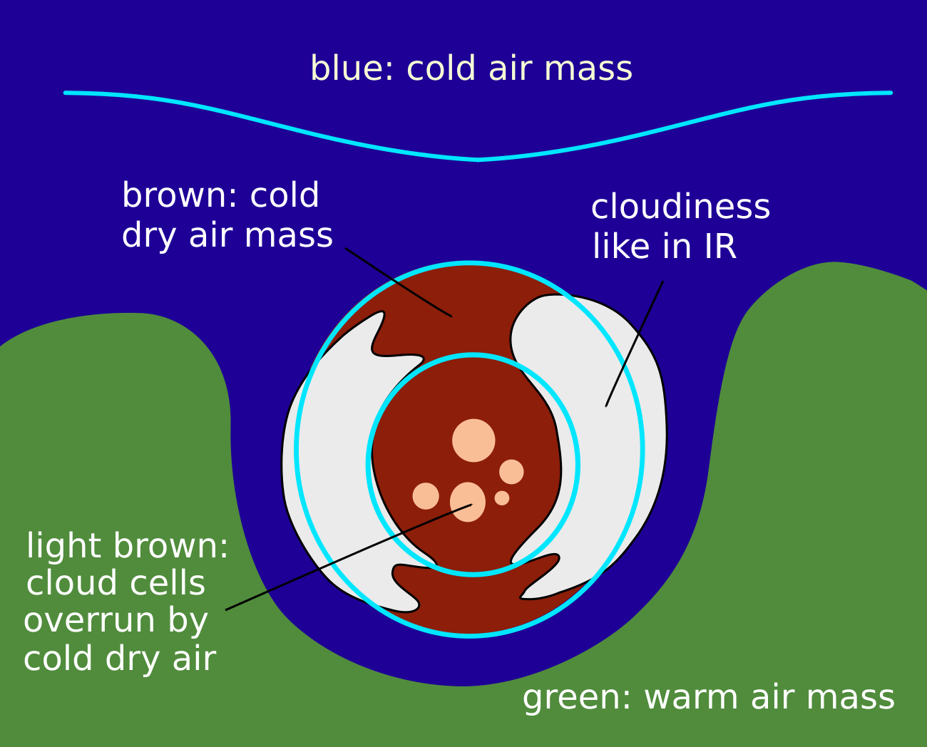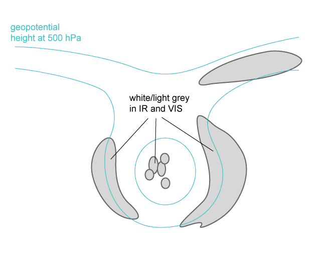 At this stage of the cut-off process, air mass composition makeup is the same as the trough stage before: dark brown colours in the centre are concentrated in the circle-like centre and cold air cloud (if it exists) is mostly overrun by this dry air, which results in a more ochre colour. Existing cloud bands at the boundaries are similar to those in the IR channel. Often the cloud band at the rear of the former trough is only weakly developed, or is not present at all.