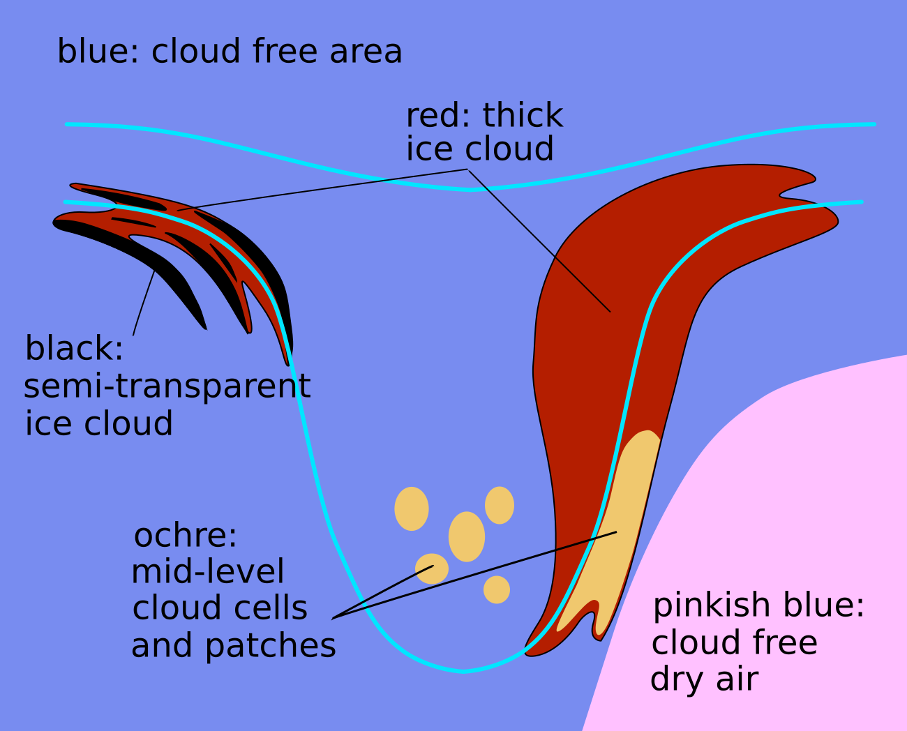- In IR10.8 images, a white or light grey cloud band is connected to the frontal zone on the leading side of the trough, while some thin white cloud stripes due to Cloud Fibres exist on the rearward side. There may possiblybe some convective white cells around the axis of the trough.