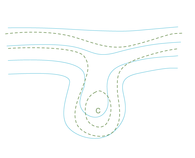 - The isohypses form an inverse omega-shape and the cold air flows into the middle of this omega.