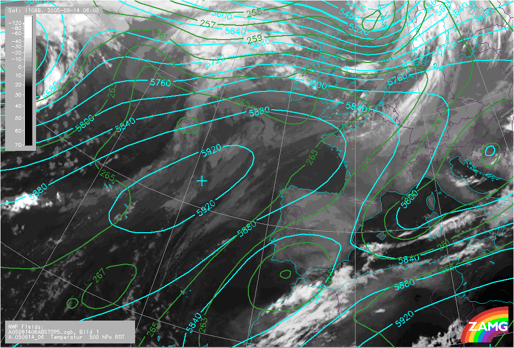 14 September 2005/06.00 UTC - Meteosat 8 IR 10.8 image; cyan: height contours 500 hPa, dark green: temperature 500 hPa