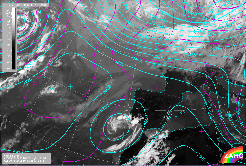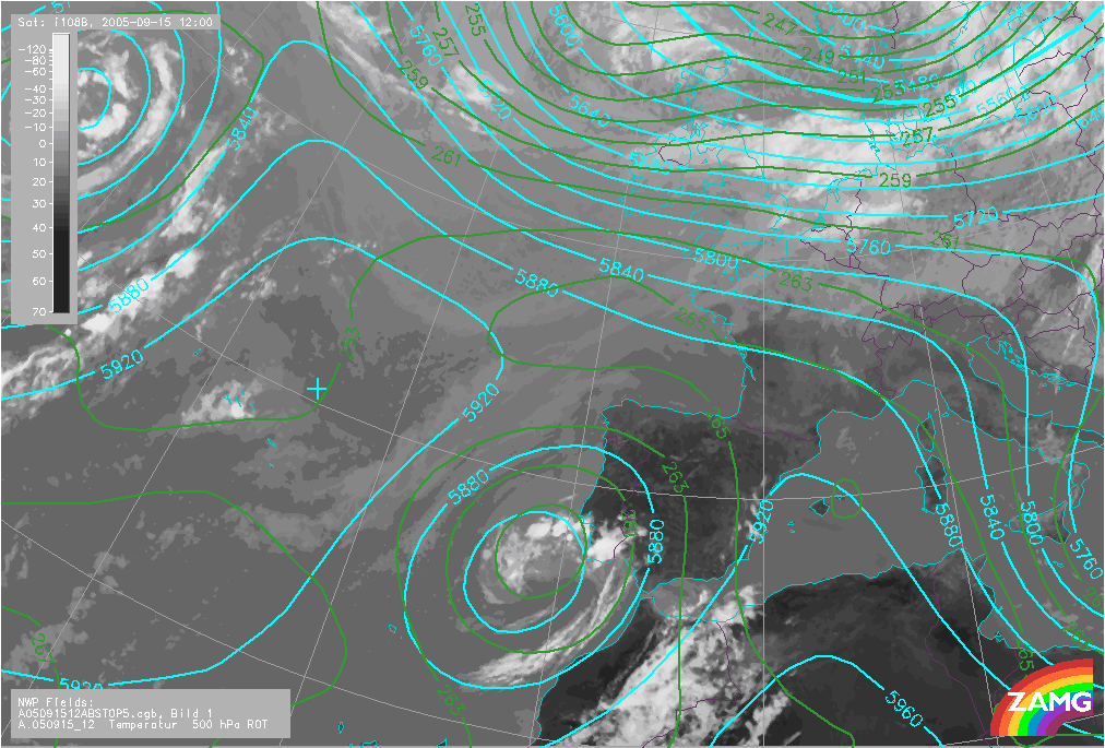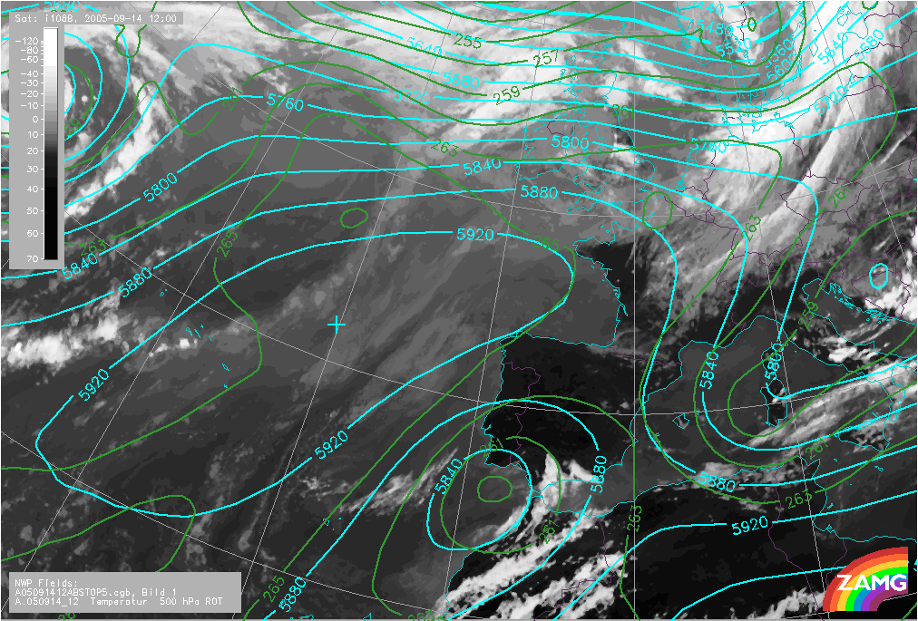 14 September 2005/12.00 UTC - Meteosat 8 IR 10.8 image; cyan: height contours 500 hPa, dark green: temperature 500 hPa