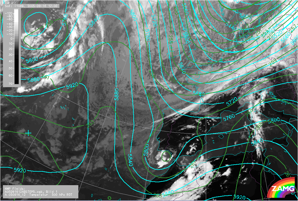 16 September 2005/12.00 UTC - Meteosat 8 IR 10.8 image; cyan: height contours 500 hPa, dark green: temperature 500 hPa