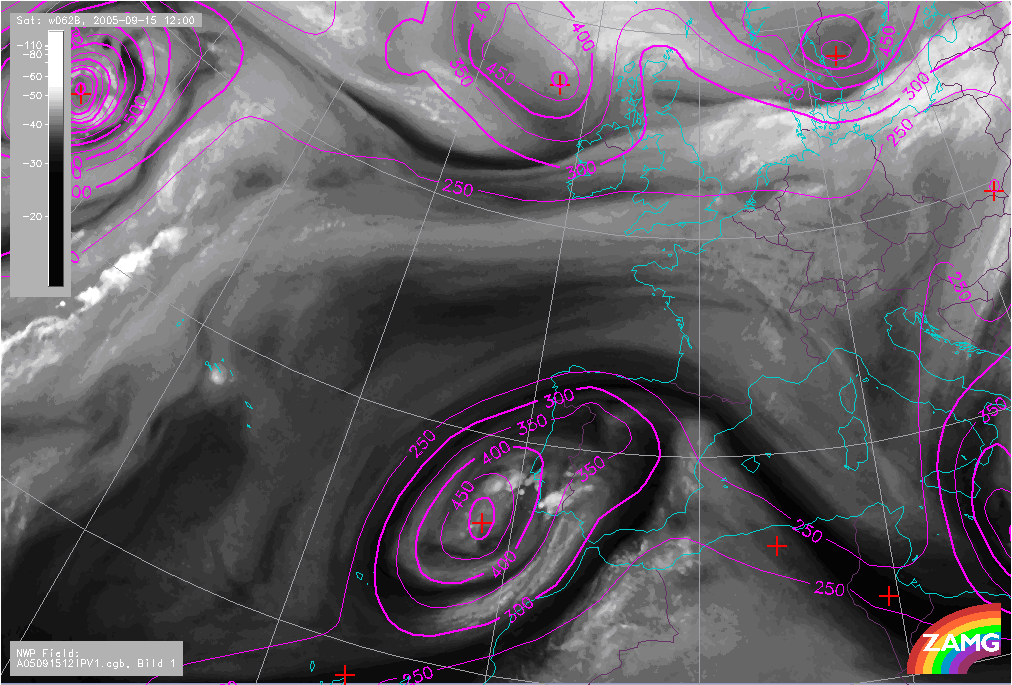 15 September 2005/12.00 UTC - Meteosat 8 WV 6.2 image; magenta: height of PV=1 unit