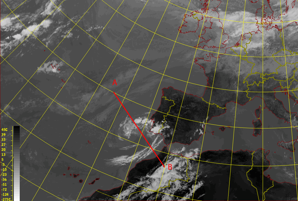 15 September 2005/12.00 UTC - Meteosat 8 IR 10.8 image; position of vertical cross section indicated