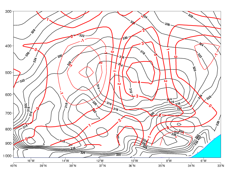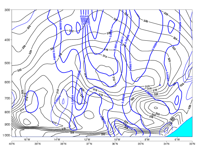 15 September 2005/12.00 UTC - Vertical cross section; black: isentropes (Thetae), blue: relative vorticity