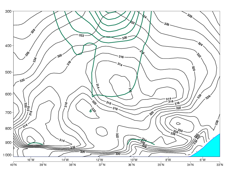 15 September 2005/12.00 UTC - Vertical cross section; black: isentropes (Thetae), dark green: potential vorticity