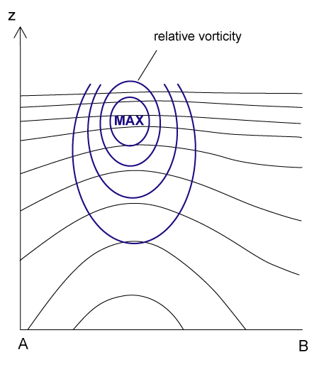 Often there is a conditionally unstable stratification in the lower and middle troposphere, with isentropic values decreasing with height. Otherwise isentropes show a shape of a ridge with the isolines far from each other in the area of the Upper Level Low. - Relative Vorticity: