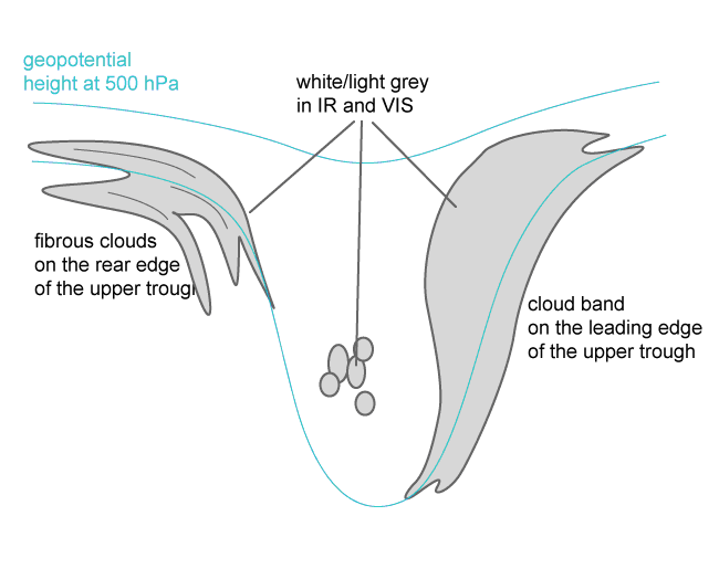 - In VIS0.6 images, a grey cyclonically curved cloud band exists on the leading side of the trough, possibly also on the rear side. Some white convective shells may occur between the bands.