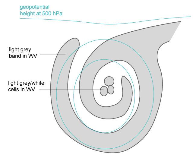 - In WV6.2 images, a round area or a spiral of grey clouds exist, with some white cells on the leading side.