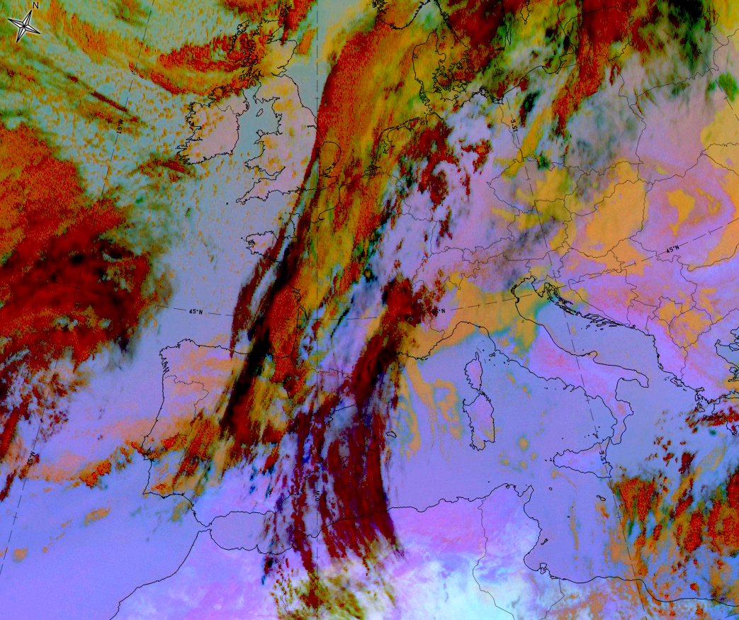 As an example, for the typical weather in a warm conveyor belt, the case of 15 January 2020 at 12 UTC is chosen. It shows a cold front cloud band from the Iberian Peninsula stretching northward into the North Sea. In front of it the clouds of a warm conveyor belt from Northern Africa across the Western Mediterranean into Southern France exist. As it is an example of a winter case, no thunderstorm reports are expected.
