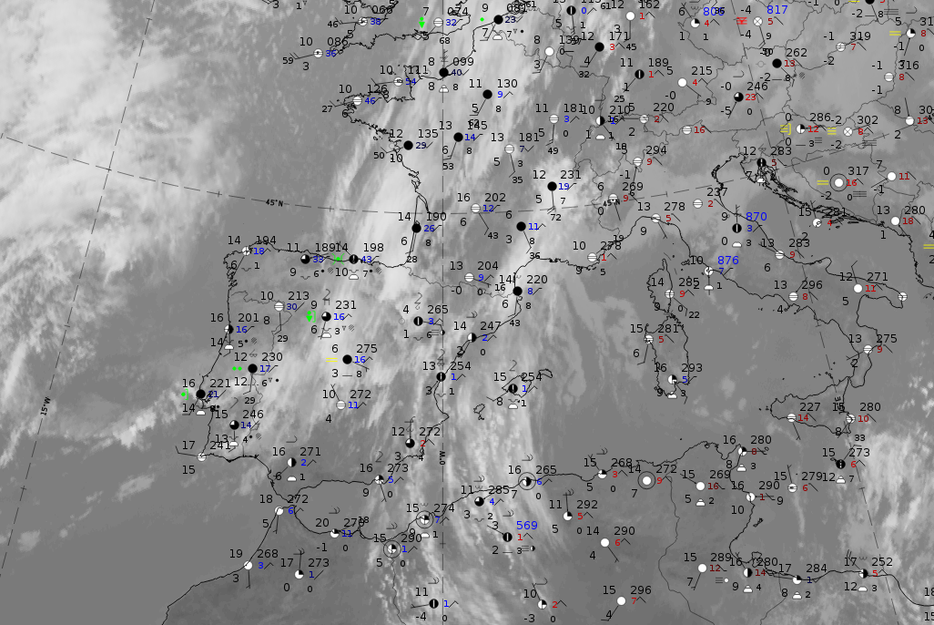 Legend: 15 January 2020 at 12UTC: IR + synoptic measurements (above) + probability of moderate rain (Precipitting clouds PC - NWCSAF).