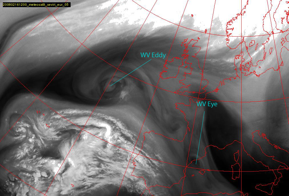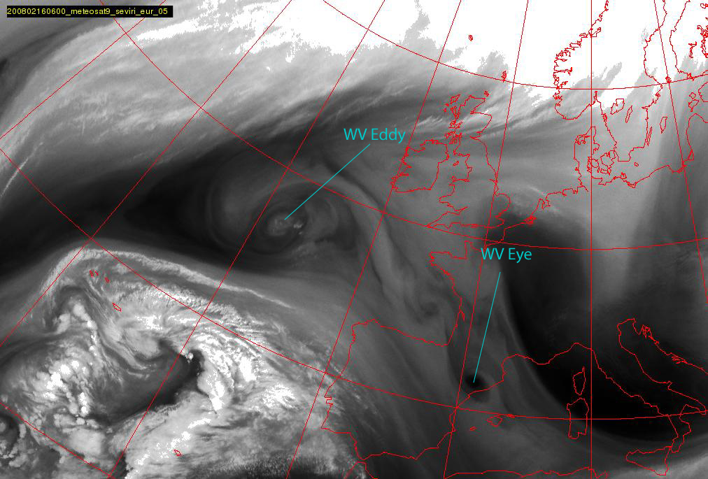 The typical satellite imagery features of this conceptual model can usually be seen only in the WV image; that means that this is a situation with little or no major cloudiness, but with distinct features in the water vapour field. Investigation of about 100 cases over a period of two years shows that a distinction can be made between different WV structures. The two prevailing structures are the so-called WV Eddies and WV Eyes.