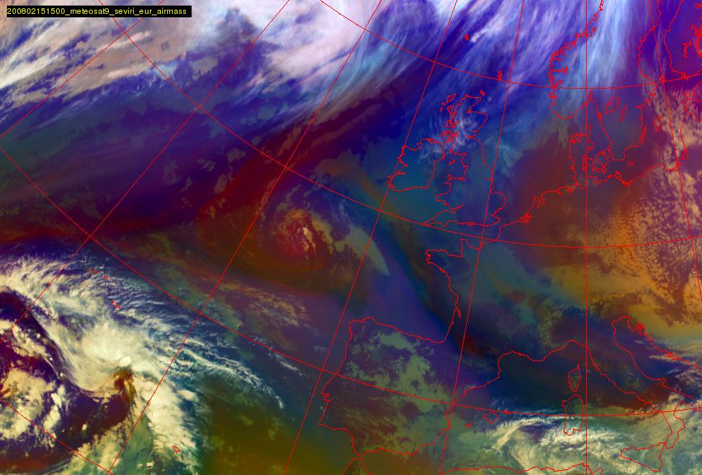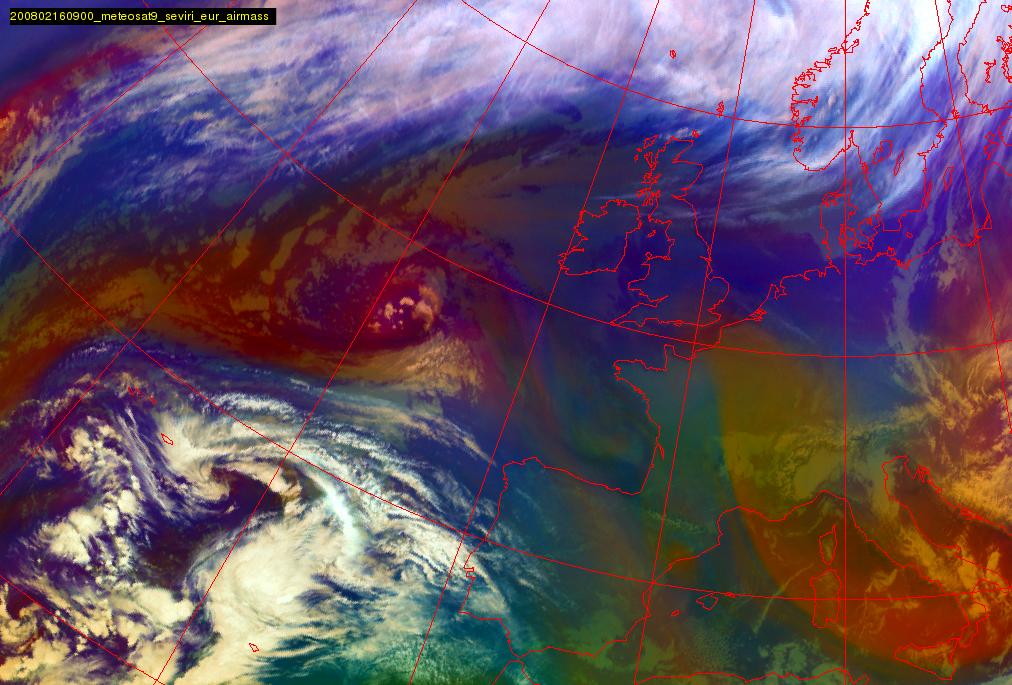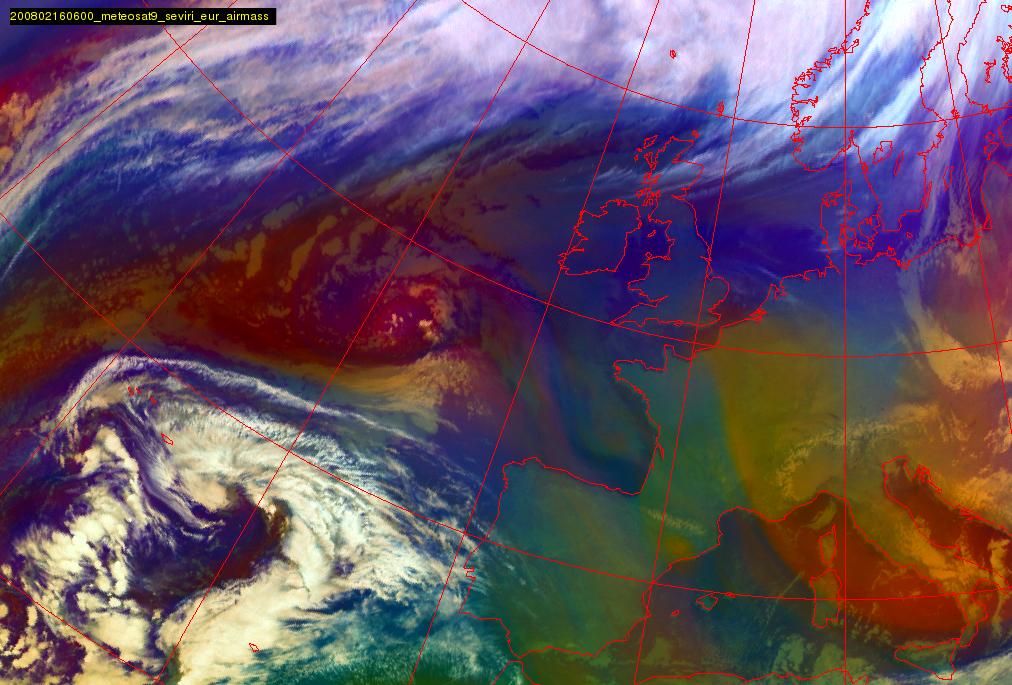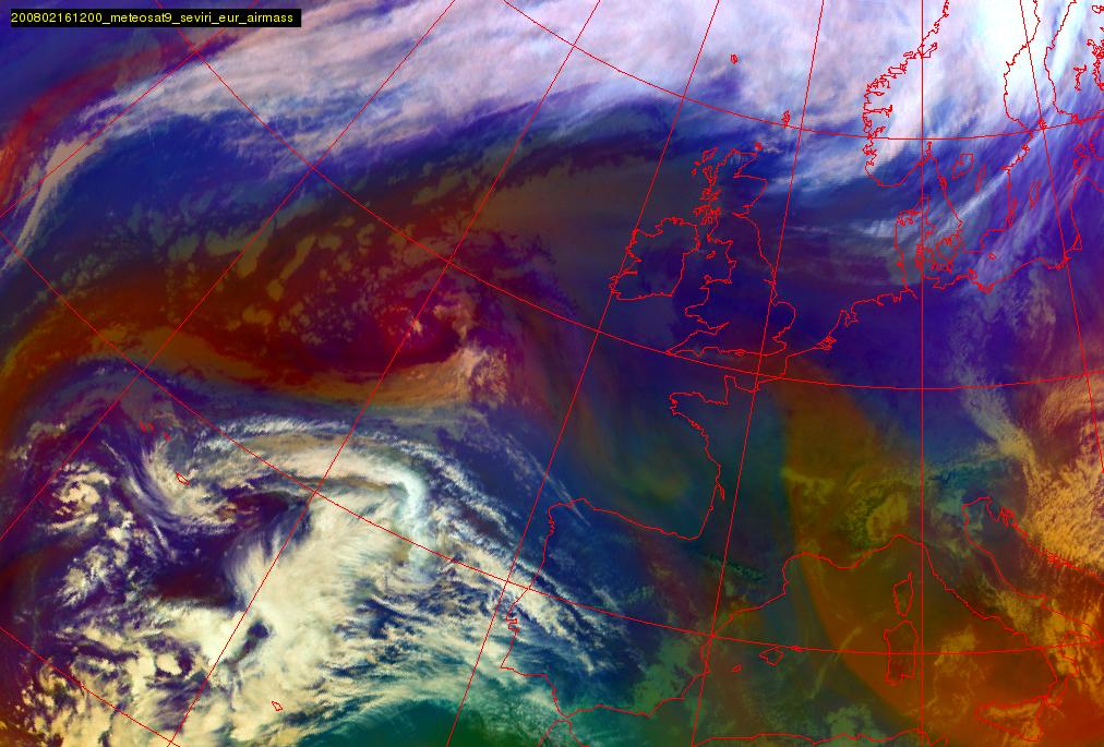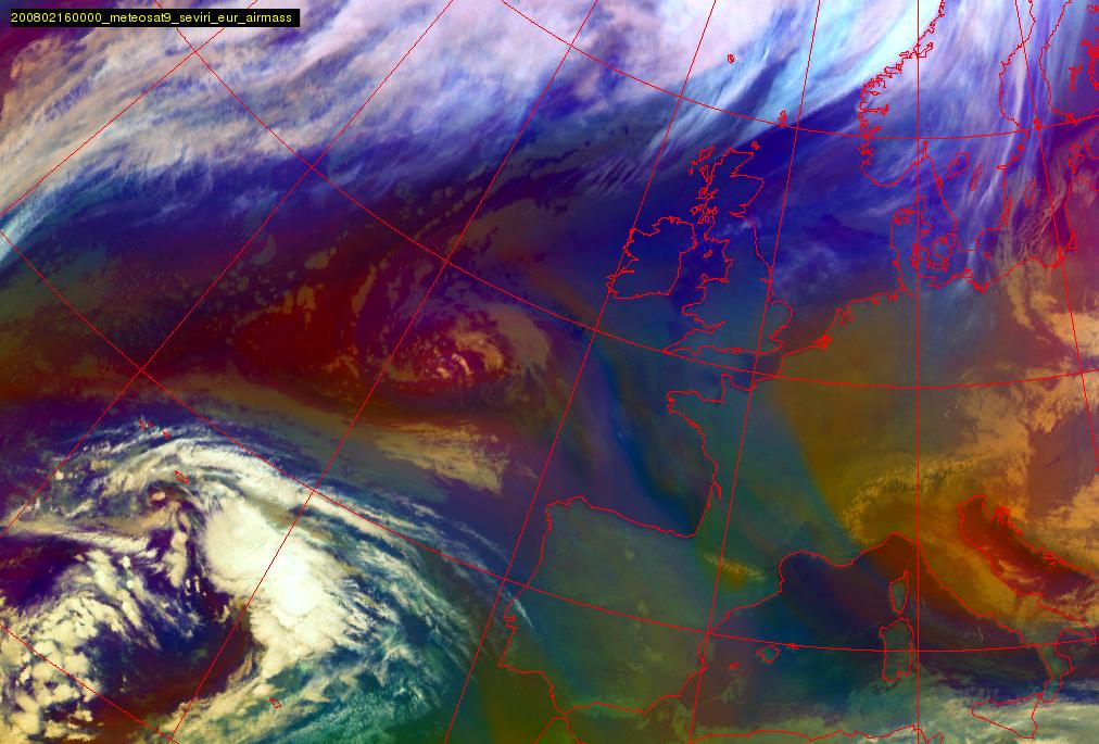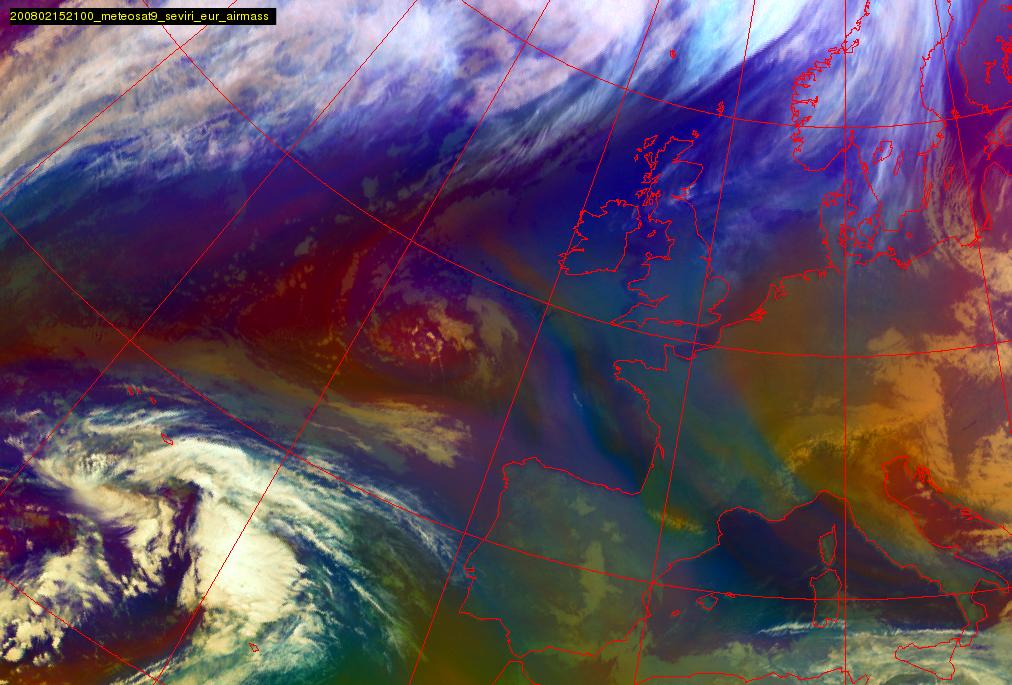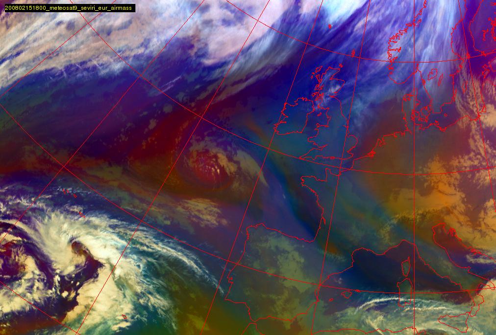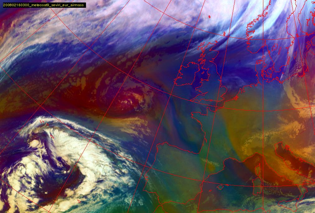 15 February 2008/12.00 UTC - Meteosat 9 Airmass RGB image; 15 February 2008/12.00 UTC - 16 February 2008/12.00 UTC 3-hourly image
