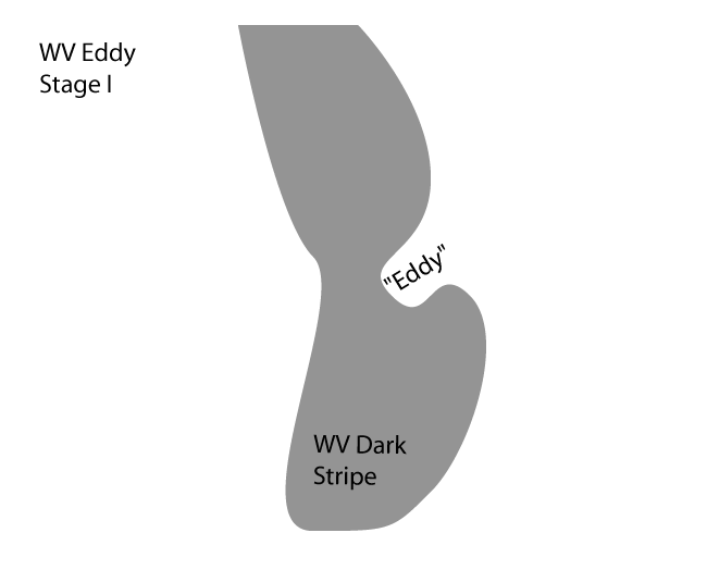 - During development a cyclonic structure forms. In the case of a WV Eddy, air with higher moisture content, spirals around drier air. In the case of a WV Eye, dry air is being surrounded by moist air and eventually a dark, round spot will be formed.