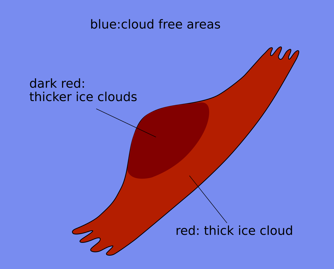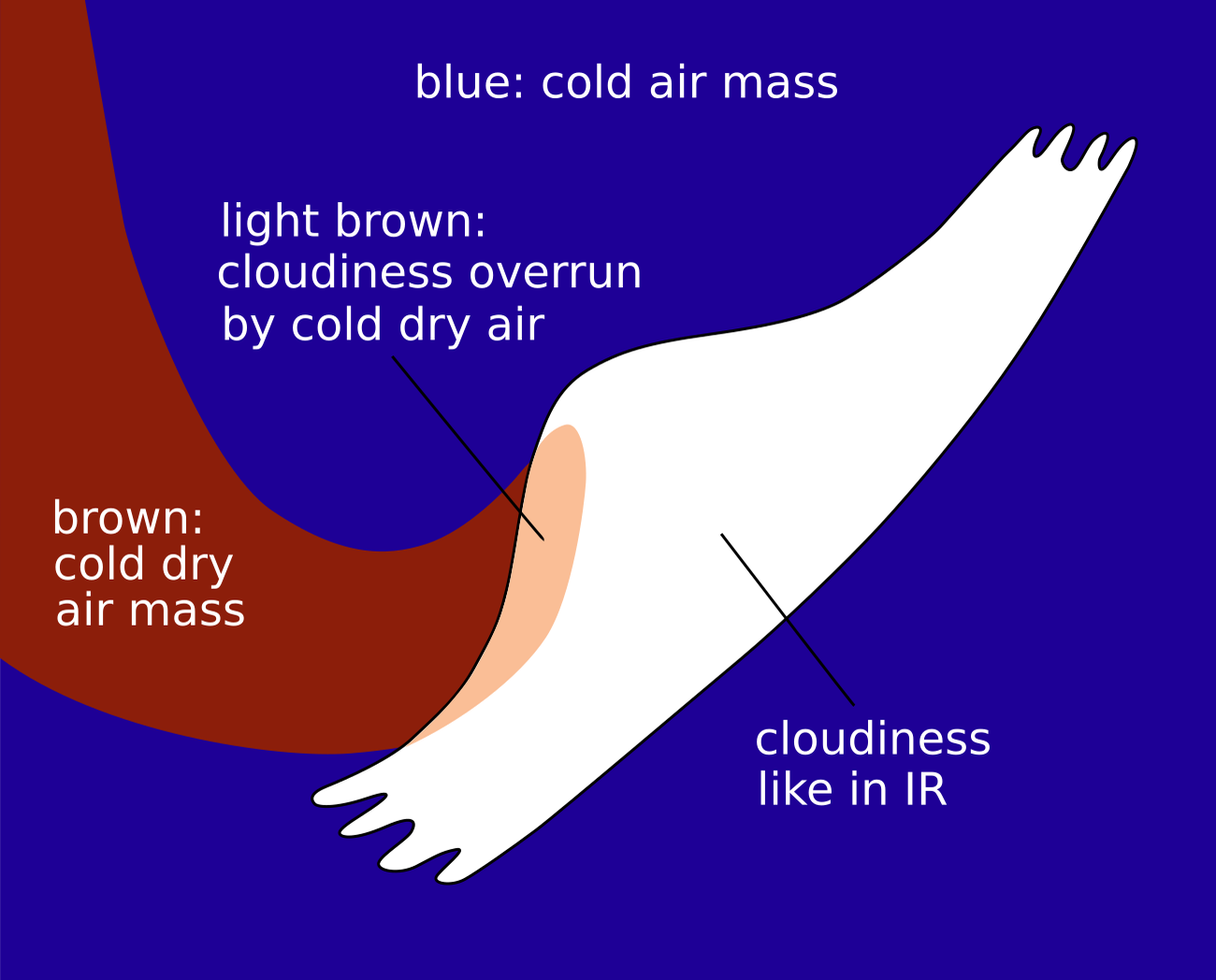 | WV | White and lumpy texture; the dark stripe at the rear represents sinking dry air. |