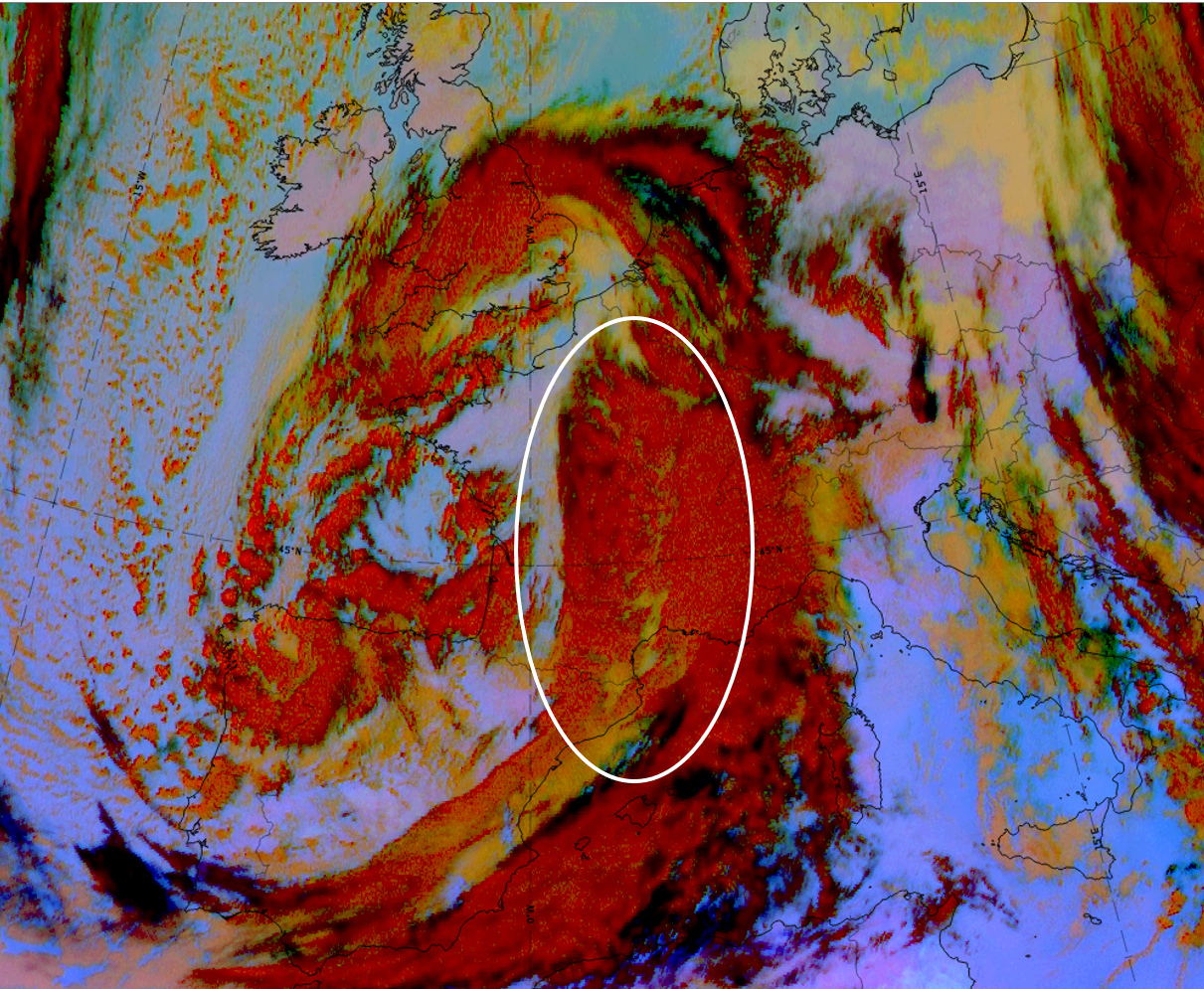 As example for studying the weather events in the area of a wave the case of 14 November 2019 at 12 UTC has been chosen. The S-shape is very pronounced but there is double structure. Together with other parameters, this double structure means that the centre of the wave development is located within the centre of the white ellipse in the figure below.