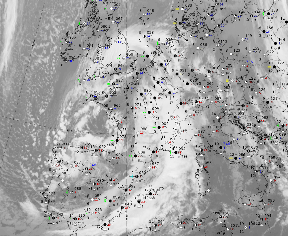 14 November 2019 at 12UTC: IR + synoptic measurements (above) + probability of moderate rain (Precipitting clouds PC - NWCSAF).