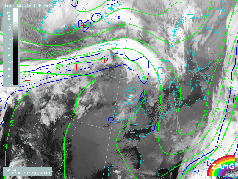 14 November 2004/00.00 UTC - Meteosat 8 IR 10.8 image; thermal front parameter (TFP) 500/850 hPa, green: equivalent thickness 500/850 hPa