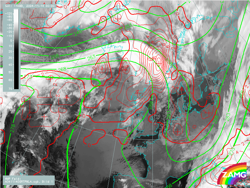 14 November 2004/00.00 UTC - Meteosat 8 IR 10.8 image; red: temperature advection 500/1000 hPa, green: equivalent thickness 500/850 hPa