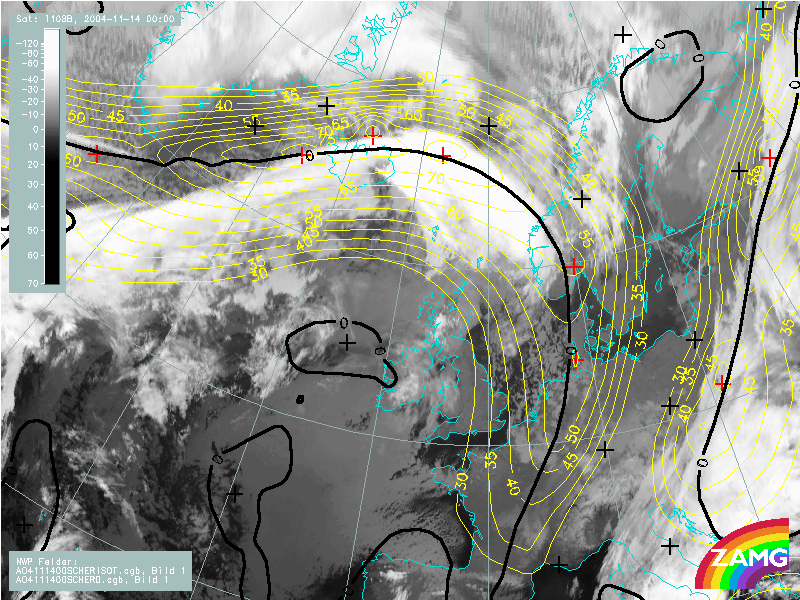 14 November 2004/00.00 UTC - Meteosat 8 IR 10.8 image; yellow: isotachs 300 hPa, black: zero line of shear vorticity 300 hPa
