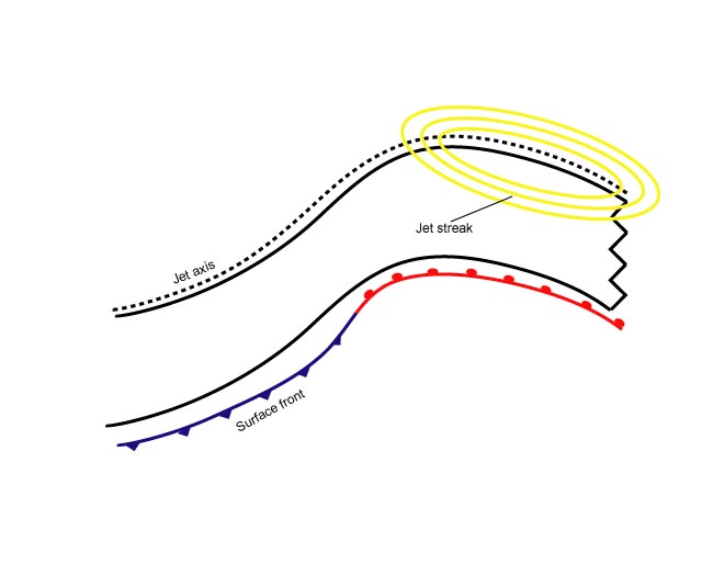 The leading edge of the Warm Front is superimposed upon a jet streak.