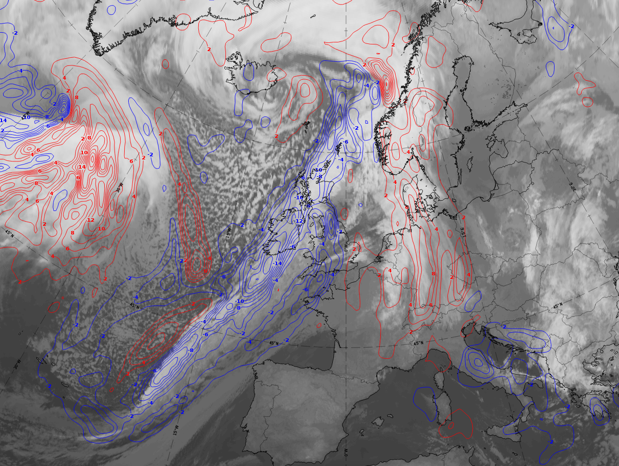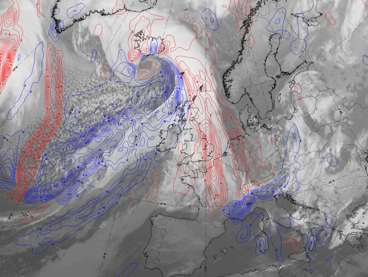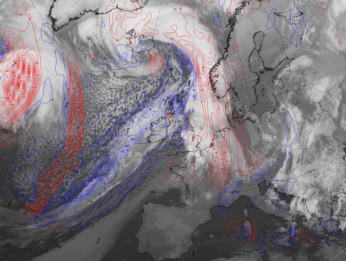 19 - 20 February 2020; 6-hourly sequence; IR + temperature advection at 700 hPa superimposed.
