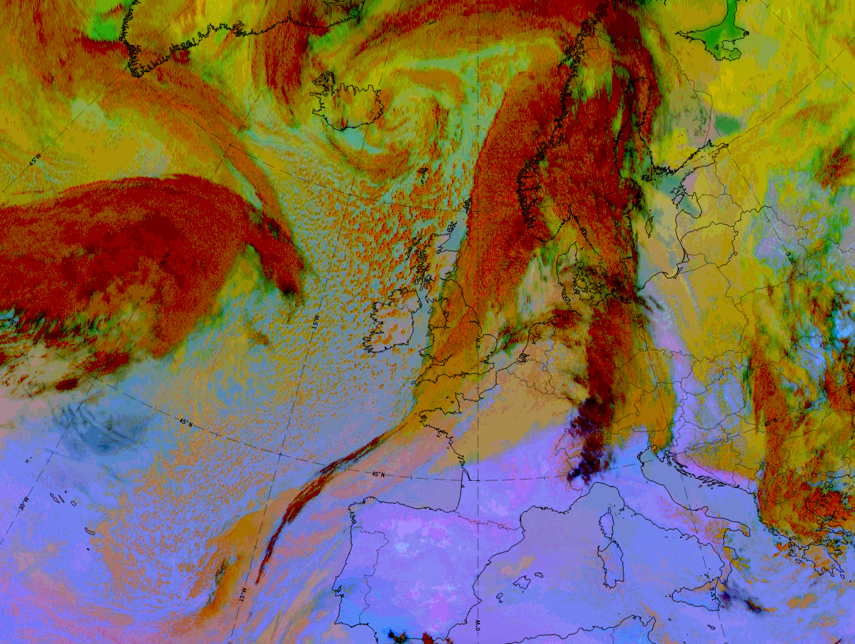 | Airmass RGB | Greenish colours at the rear and above the white cloud of the detached warm front, changing the white colours of the cloud to a darker shade. A dark brown stripe in front of the WF belongs to the trough area of the preceding system. |