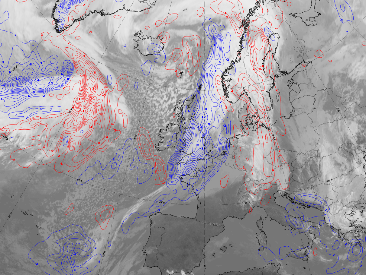 The cloud band looks very similar to that in the IR image. However, there are often areas overlaid with the greenish colour, representing the approaching warmer air, adding a greenish shade to the white colours of the cloud.