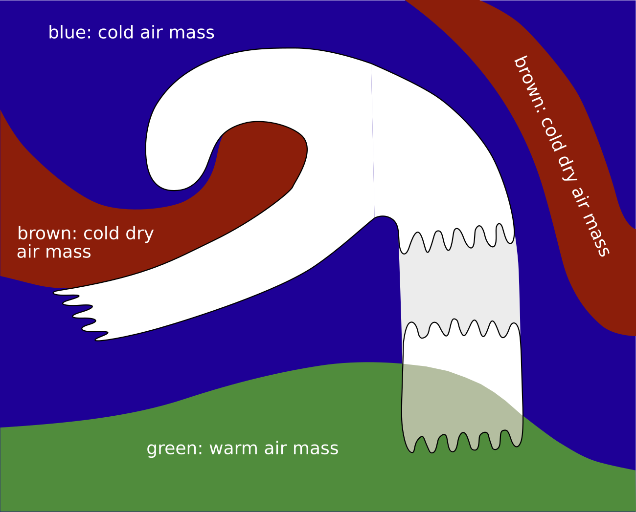 In front of the cloud band of the Detached Warm Front there is blue colour and, predominately, a dark brown stripe. Both belong to the rear side, the trough, of the preceding frontal system (to its rear). On the rear side, which is the area between the detached warm front and the consecutive cold front, greenish colours dominate, indicating the warmer air from the south and southwest.