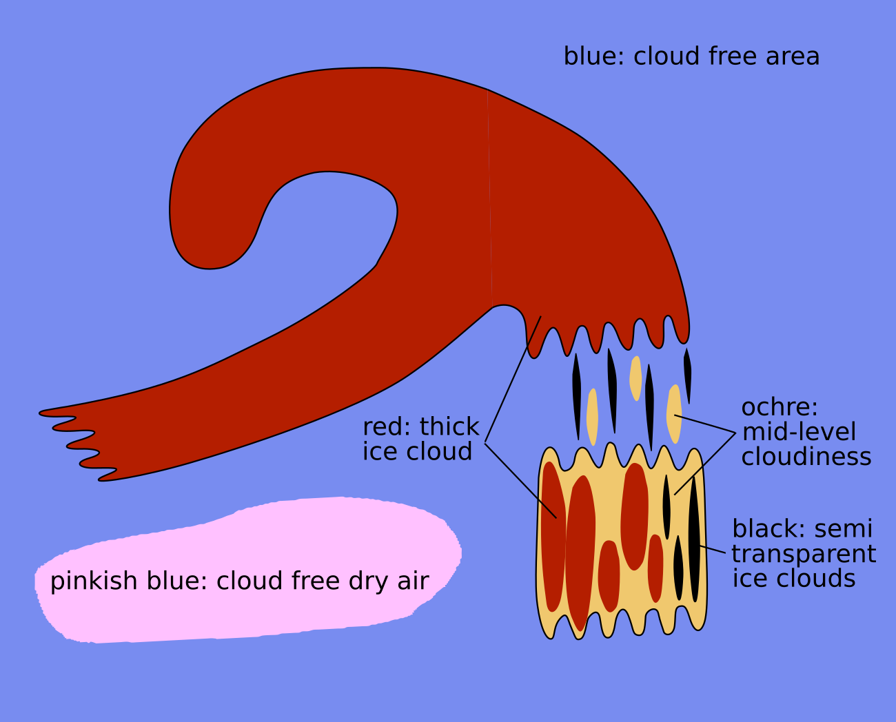 The cloud band itself appears in ochre, overlaid by dark red cloud where there is thick ice cloud. However, black fibrous areas also occur, indicating thin translucent ice cloud. These black fibres are mostly at the leading edge, indicating the jet axis there, as well as extending to the south of the cloud band of the Detached Warm Front.