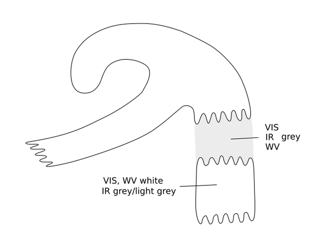| WV | Wide light grey area with bright colours where the white cloud of the detached warm front occurs. |