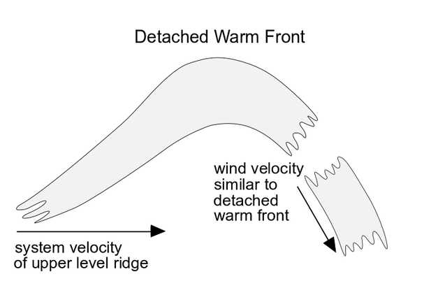 In the case of an eastward moving classical frontal system the Detached Warm Front is mostly observed within the eastern branch of a pronounced synoptic scale ridge in the height and thickness fields, accompanied by strong winds in higher levels of the troposphere (approximately at 500 hPa) which blow normal to the movement of the ridge system.