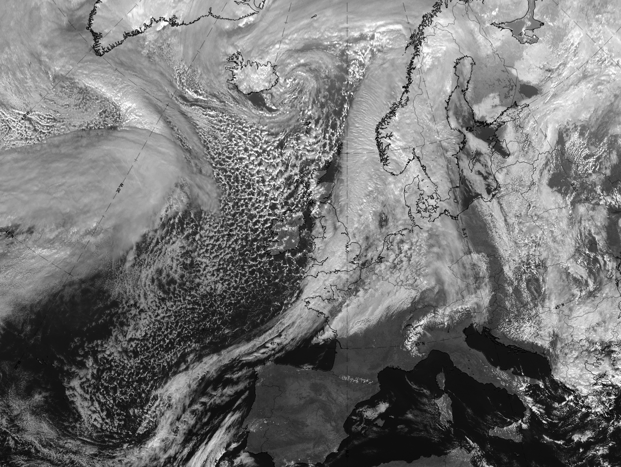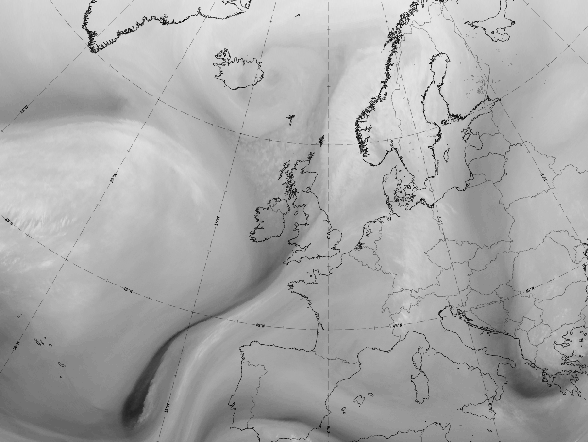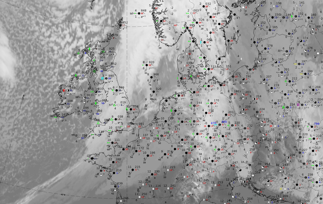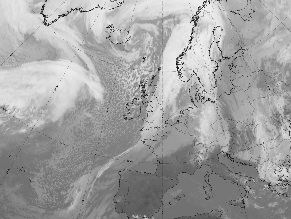 The cloud band looks very similar to that in the IR image. However, there are often areas overlaid with the greenish colour, representing the approaching warmer air, adding a greenish shade to the white colours of the cloud.