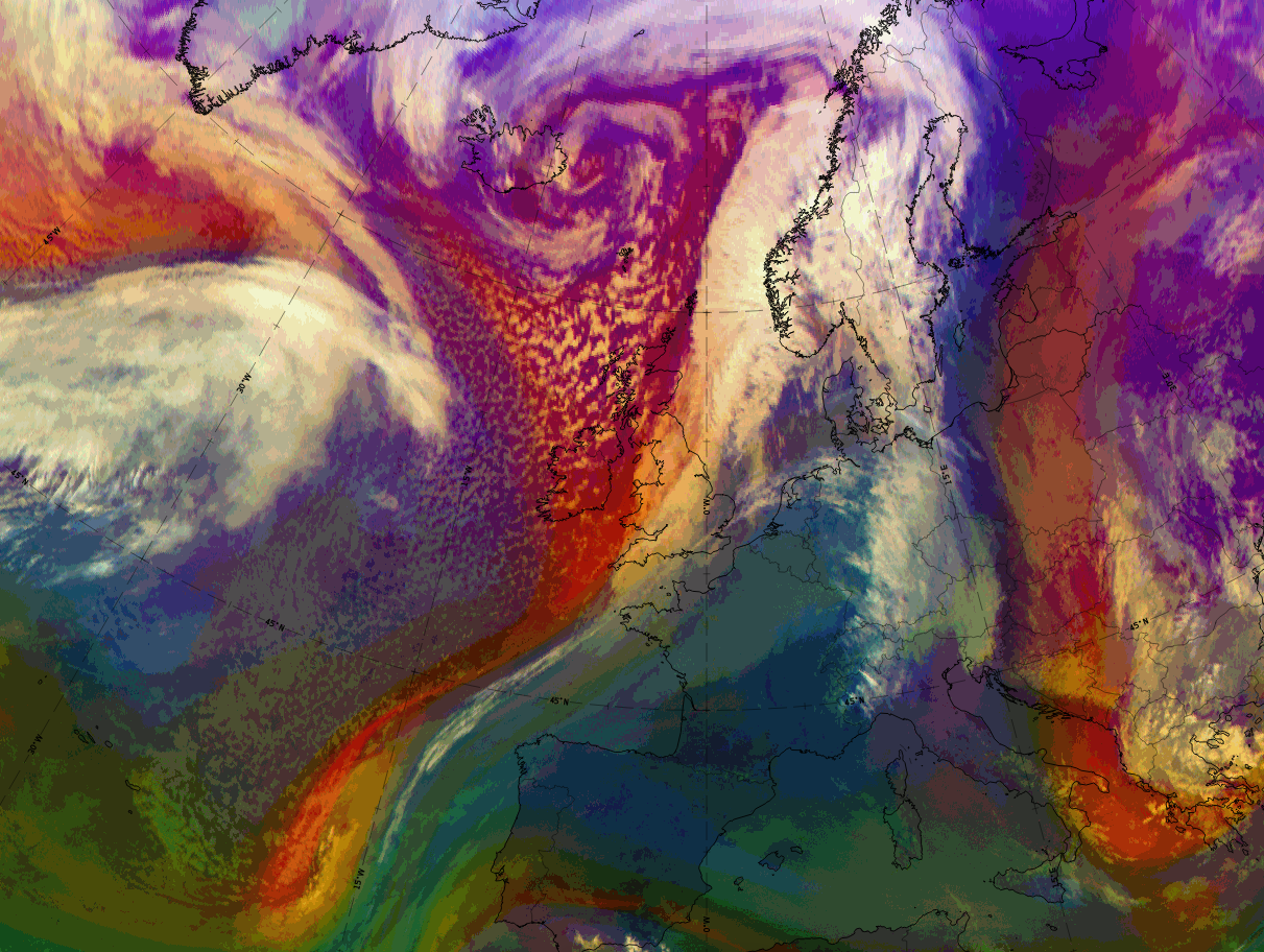 The cloud band itself appears in ochre, overlaid by dark red cloud where there is thick ice cloud. However, black fibrous areas also occur, indicating thin translucent ice cloud. These black fibres are mostly at the leading edge, indicating the jet axis there, as well as extending to the south of the cloud band of the Detached Warm Front.
