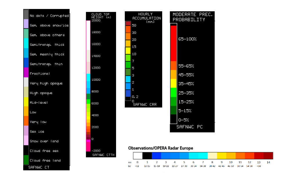 1st row: Cloud Type (CT NWCSAF) (above) + Cloud Top Height (CTTH - NWCSAF) (below); 2nd row: Convective Rainfall Rate (CRR NWCSAF) (above) + Radar intensities from Opera radar system (below).