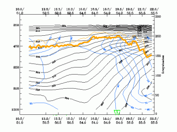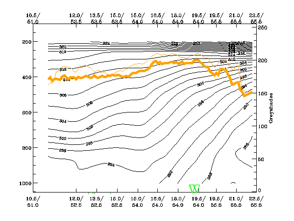 4 January 2005/00.00 UTC - Vertical cross section; black: isentropes (ThetaE), orange thin: IR pixel values, orange