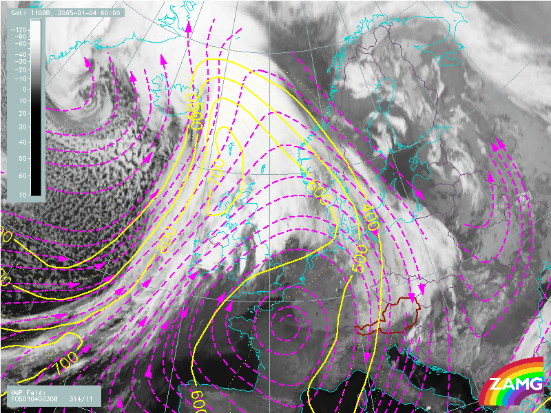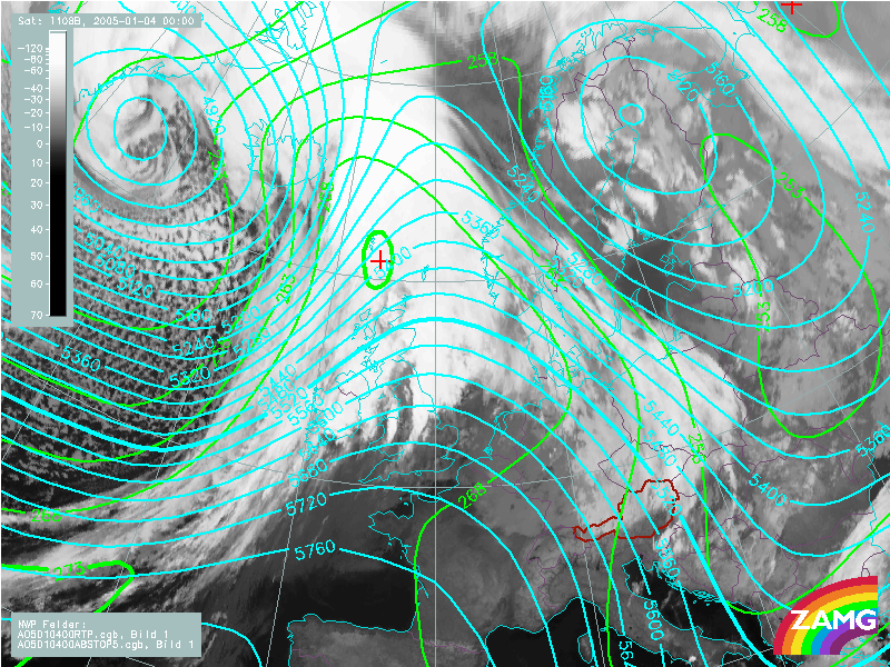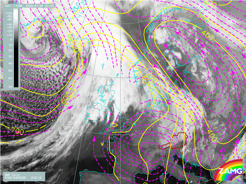 04 January 2005/00.00 UTC - Meteosat 8 IR 10.8 image; blue: geopotential height 500 hPa, green: equivalent
