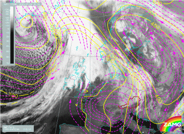 4 January 2005/00.00 UTC - Meteosat 8 IR 10.8 image; magenta: relative streams 296K - system velocity: 315°