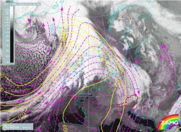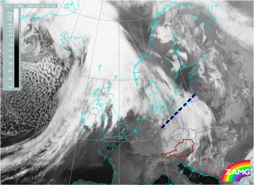 The IR loop shows the development of the Detached Warm Front. Special attention should be paid at the time when the Detached Warm Front reaches the Alps. As it then moves eastward, more cloud moves southward on the eastern edge of the Alps over Slovenia.