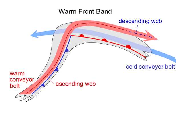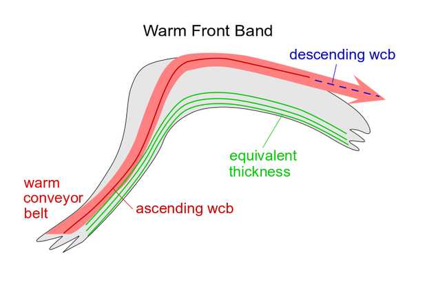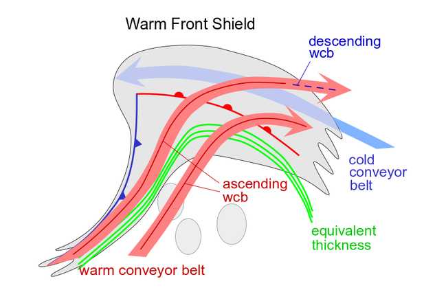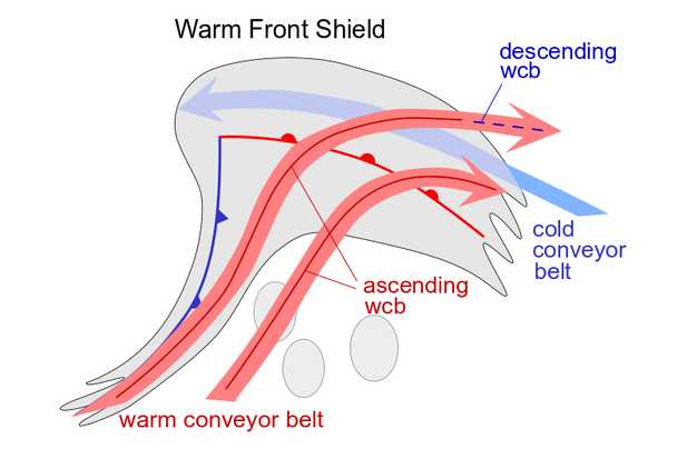 The leading edge of the Warm Front cloud shield is superimposed upon a jet streak with intensities varying from case to case.