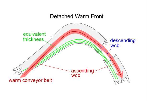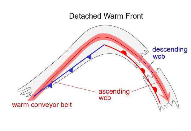 - Often the cloudiness of the Detached Warm Front cloud moves downstream from a classical Warm Front system and becomes an independent system.